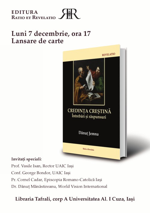 Luni, 7 decembrie 2015, de la ora 17.00, la Libraria Tafrali, va avea loc lansarea volumului „Credinta crestina. Intrebari si raspunsuri” (Ed. Ratio et Revelatio, 2015) de Danut Jemna. La eveniment vor participa domnul prof. univ. dr. Vasile Isan, Rectorul Universitatii „Alexandru Ioan Cuza” din Iasi, conf. univ. dr. George Bondor, preot Cornel Cadar de la Episcopia Romano-Catolica Iasi si dr. Danut Manastireanu de la World Vision International. Libraria se afla sub scarile de la intrarea centrala a corpului A al Universitatii.