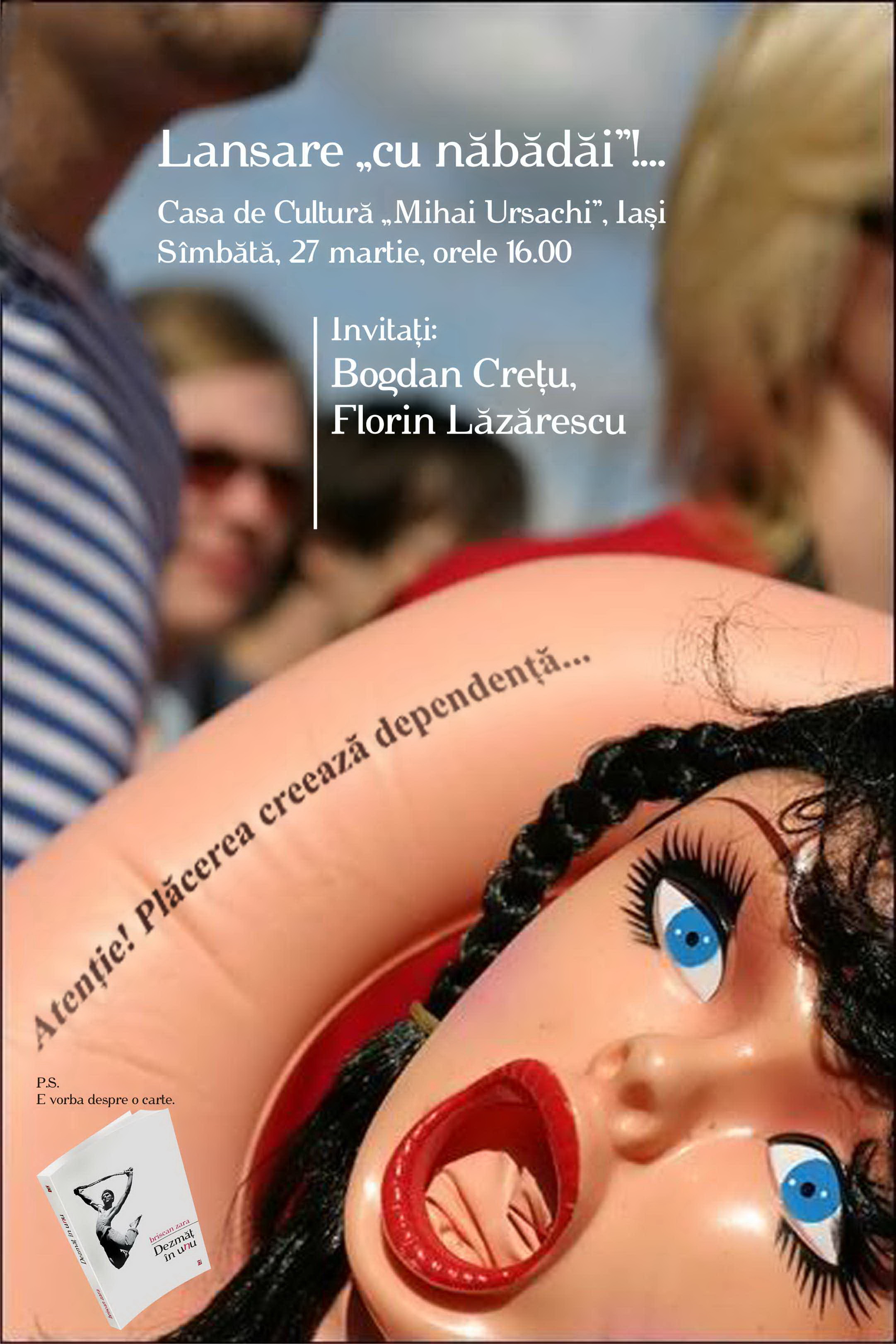 Sambata, 27 martie, ora 16.00, la Casa de Cultura Mihai Ursachi, Briscan Zara va invita la lansarea romanului sau de debut, Dezmat in unu. Invitati vor fi: Florin Lazarescu si Bogdan Cretu.