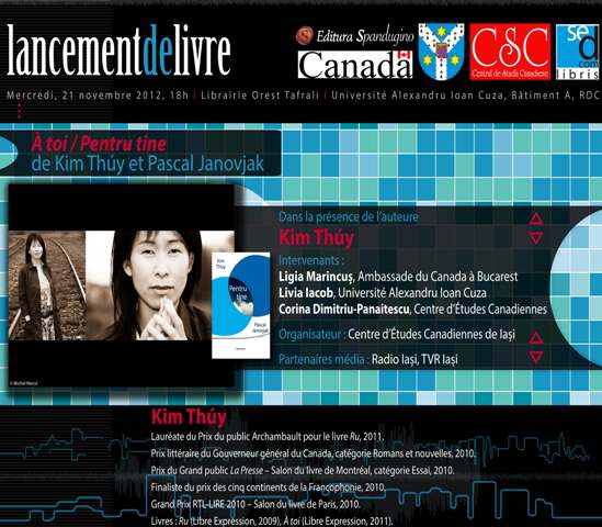 Eveniment a fost planuit de Ambasada Canadei, de Centrul de Studii Canadiene din Iasi, precum si de Editura Spandugino si isi propune sa anunte publicarea cele de-a doua aparitii editoriale cosemnate de scriitoarea canadiana, de origine vietnameza, Kim Thuy, alaturi de franco-slovaco-elvetianul Pascal Janovjak. Pentru tine – caci despre aceasta carte discutam – este un schimb de replici, de reflectii, de impresii si amintiri intr-un registru presupus a fi cu atat mai proaspat, cu cat cei doi scriitori s-au intalnit cu putin timp inainte de a hotari ca e necesar sa se expuna intr-un astfel de joc literar. Aveau, insa, in comun stigmatul de copii ai exilului si ai nomadismului, chestiuni care ii interesau cat se poate de mult, asa ca frazele nu puteau decat sa curga cu spor in corespondenta pe care au tinut-o.