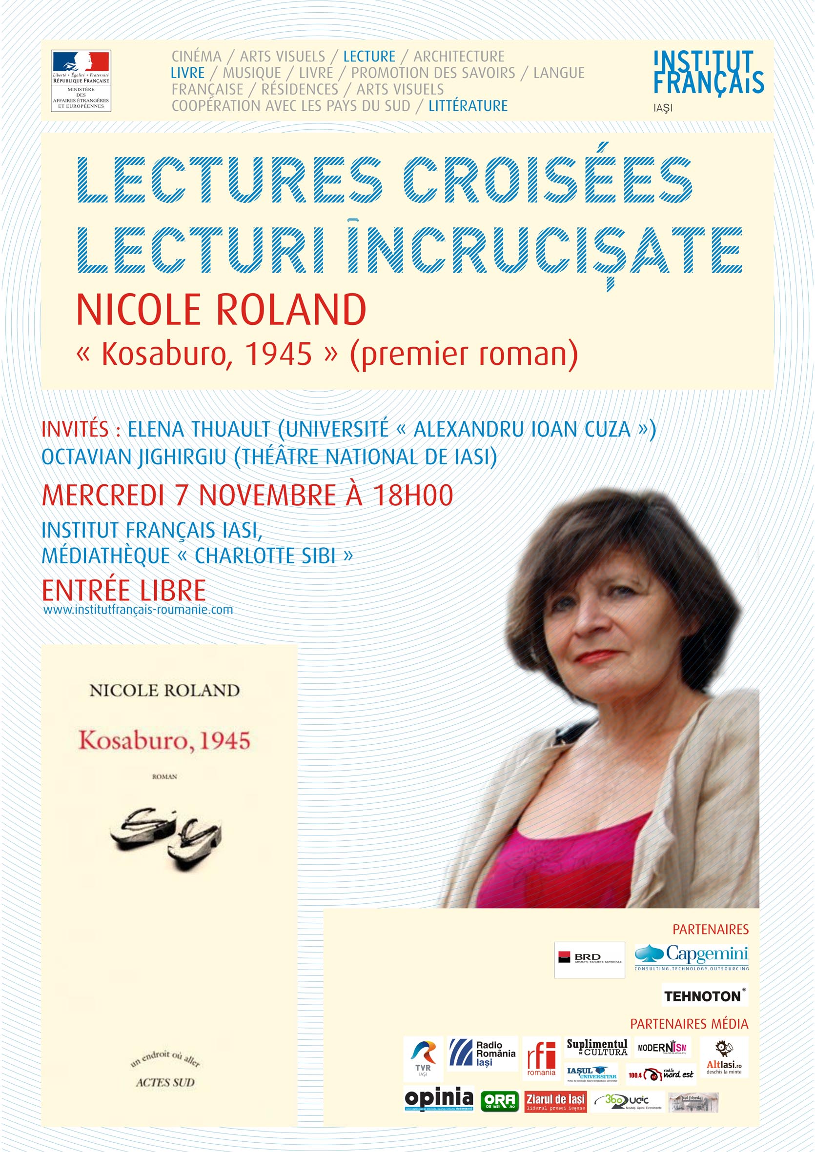 Miercuri, 7 noiembrie, la ora 18.00, sunteti asteptati la Mediateca „Charlotte Sibi” a Institutului francez Iasi, pentru o noua sesiune de Lecturi incrucisate. De aceasta data, este vorba de romanul de debut al scriitoarei belgiene Nicole Roland - „Kosaburo, 1945”.