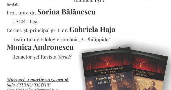 Miercuri, 4 martie 2015, incepand cu ora 16.00, in sala Studio Teatru, va avea loc lansarea volumelor cartii „Munca actorului cu sine insusi” de Konstantin Sergheievici Stanislavski.