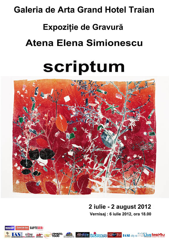 Galeria de Arta Grand Hotel Traian sarbatoreste 2 ani de zile de la infiintare. Expozitia de gravura aleasa sa marcheze acest eveniment, intitulata Scriptum, ii apartine rectorului Universitatii de Arte George Enescu, Atena Simionescu, si poate fi vizitata in perioada 6 iulie – 2 august.