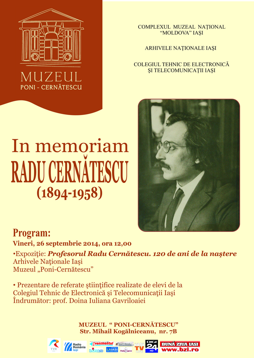 Muzeul „Poni – Cernatescu” din cadrul Complexului Muzeal National „Moldova” Iasi onoreaza in perioada 26 septembrie - 26 octombrie 2014 personalitatea lui Radu Cernatescu, primul profesor de chimie analitica al Universitatii din Iasi. Vineri, 26 septembrie, de la ora 12.00, la Muzeul „Poni-Cernatescu” are loc vernisajul expozitiei „Profesorul Radu Cernatescu. 120 de ani de la nastere”, care contine documente, fotografii, carti de specialitate din inventarul documentar al Arhivelor Nationale Iasi - Fondul familial Poni, precum si din patrimoniul Muzeului „Poni-Cernatescu”.