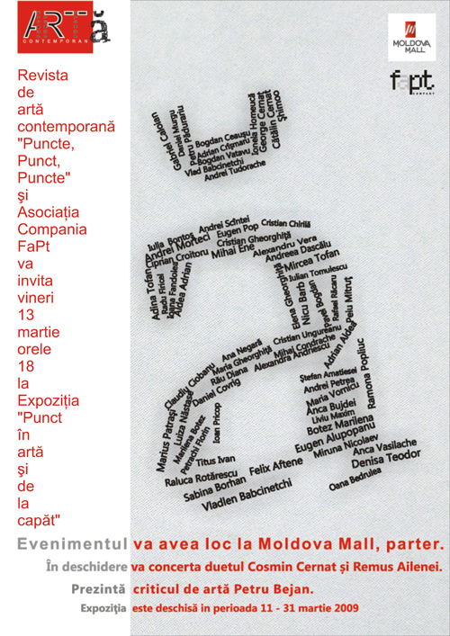 Revista de arta contemporana “Punct Punct Puncte” implineste 1 an! Evenimentul va fi marcat printr-o expozitie intitulata "Punct in arta si de la capat", al carei vernisaj va avea loc vineri, 13 martie, ora 18.00, la parterul magazinului Moldova Mall. De asemenea, va fi lansat numarul 12 al revistei.