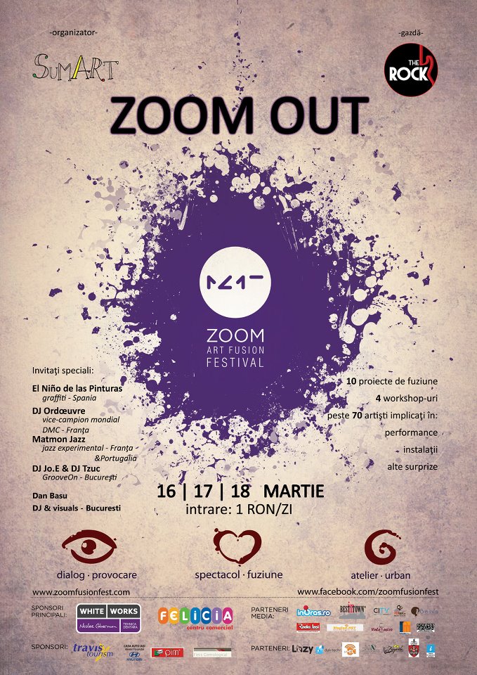 Dupa o prima saptamana plina de evenimente, ZOOM Art Fusion Festival continua cu al doilea week-end, de incheiere, intitulat sugestiv ZOOM OUT. De data aceasta gazda va fi clubul The Rock, intrarea pentru evenimentele din datele de 16, 17 si 18 martie avand acelasi pret simbolic de 1 leu.
