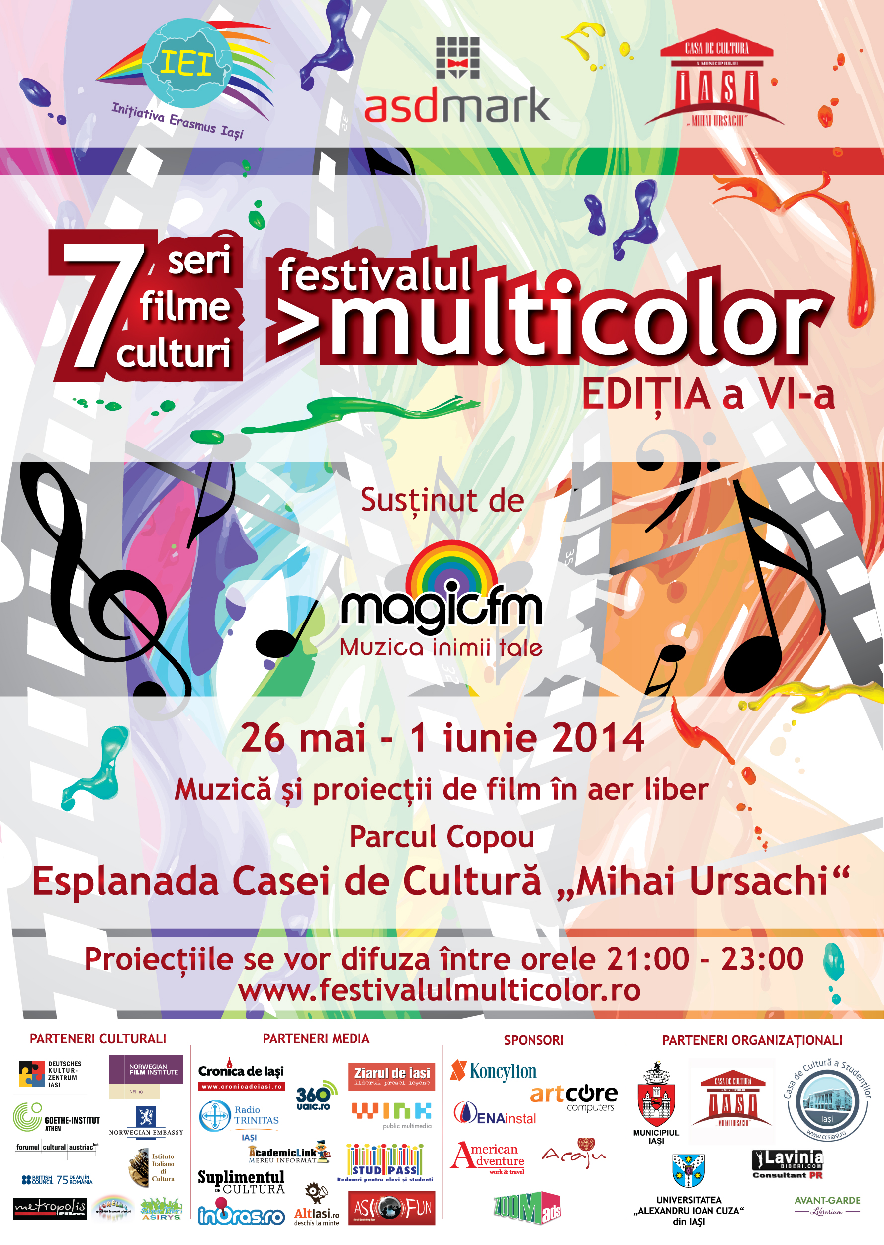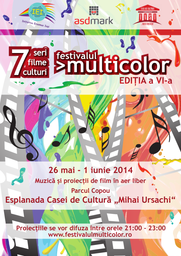 Festivalul Multicolor a ajuns in 2014 la cea de-a sasea editie. Ca in fiecare an, timp de 7 zile doritorii vor putea sa vada filme si sa asculte muzica provenind din 7 tari europene, cite una in fiecare zi. Organizat de Erasmus Iasi in parteneriat cu AsdMark si gazduit de Casa de Cultura „Mihai Ursachi”, festivalul se va desfasura intre 26 mai – 1 iunie, proiectiile incepind in fiecare seara de la ora 21. Intrarea este libera, iar pe participanti ii asteapta tombole si alte surprize.