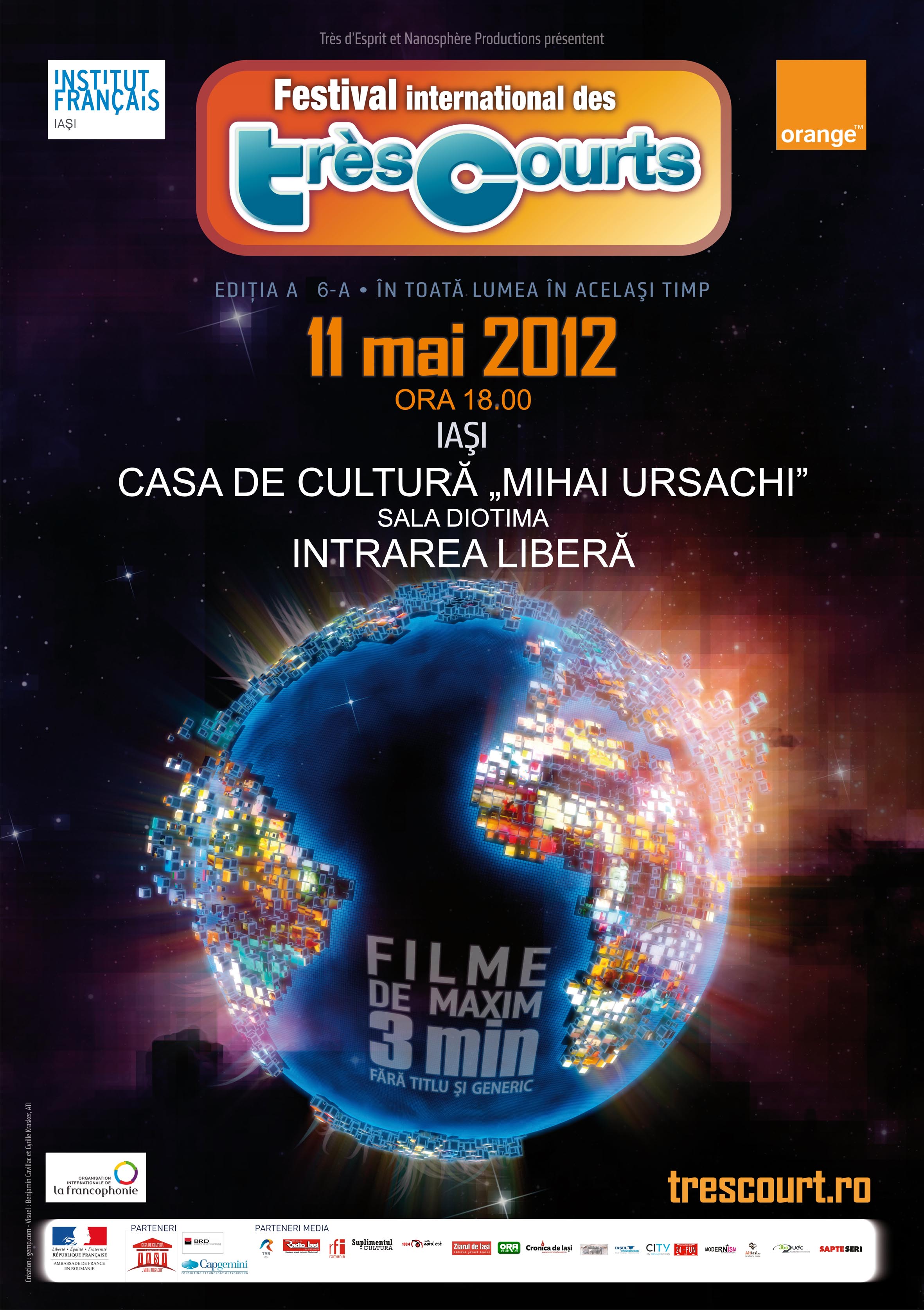 Deja celebrul eveniment dedicat filmelor de foarte scurtmetraj (maxim 3 minute), Tres court se desfasoara (aproape) simultan in 80 de tari din intreaga lume si in 25 de orase din Romania. In Iasi se poate vedea ceva mai tarziu, adica vineri, 11 mai, de la ora 18:00 la Casa de Cultura „Mihai Ursachi” din Parcul Copou. Intrarea este libera.