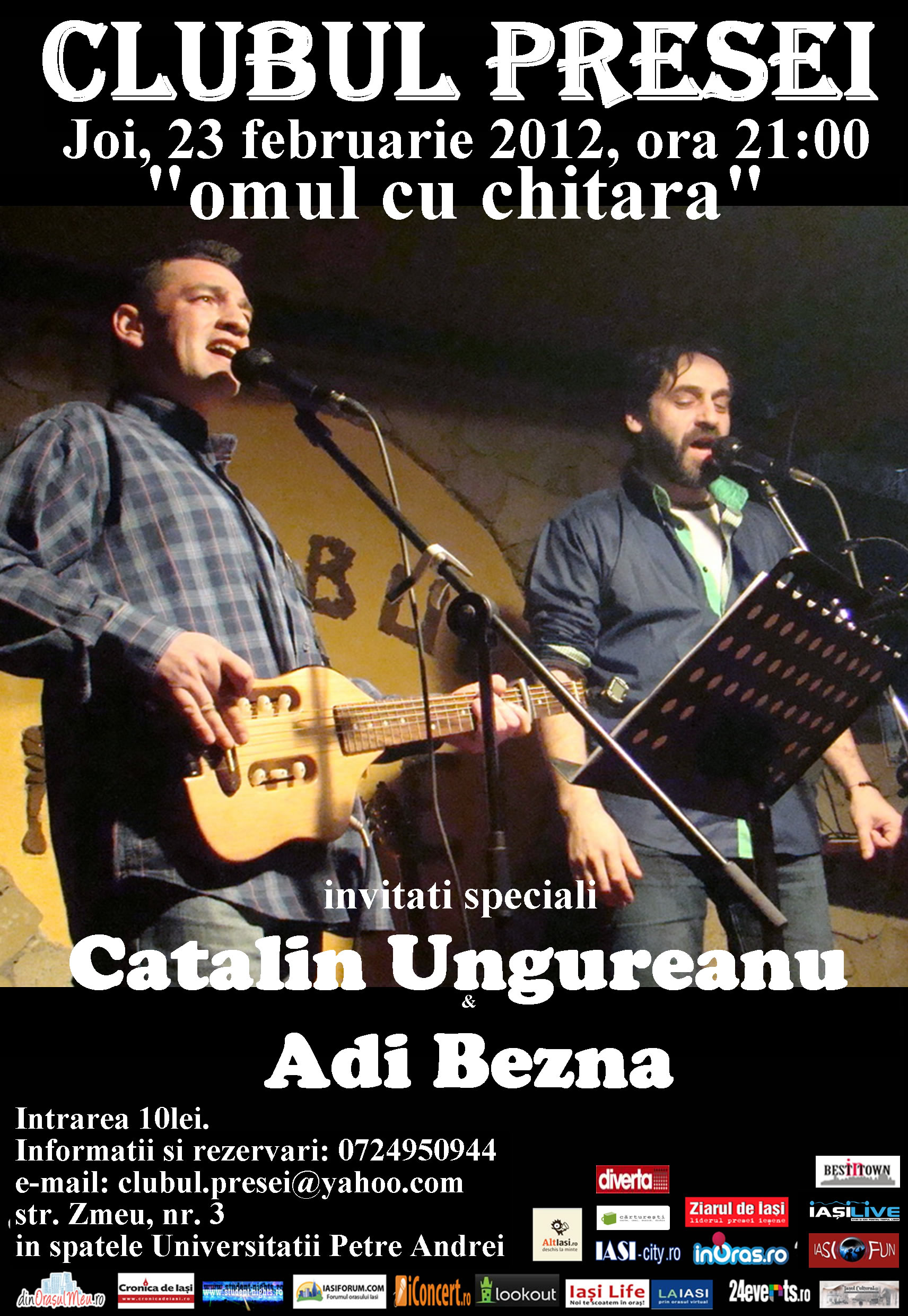 Omul cu chitara, o imagine reprezentativa pentru muzica folk, este titulatura evenimentului care a devenit deja o traditie in Clubul Presei, acolo unde in fiecare seara de joi isi dau intalnire artisti si prieteni ai acestui gen muzical. Pe 23 februarie, de la ora 21, vor reveni in fata publicului iesean Adi Bezna si Catalin Ungureanu.