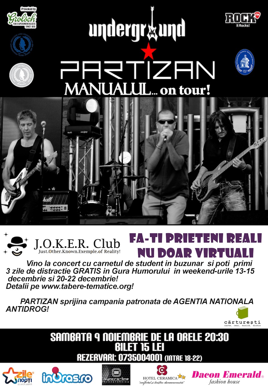 In aceeasi seara in care Dan Iliescu aduce o noua formula Timpuri Noi la Iasi, Adrian Plesca – mai cunoscut drept Artan – canta la cativa zeci de metri mai departe, in Club Underground. Pentru a vedea la lucru trupa Partizan trebuie deci sa va prezentati sambata, 1 decembrie, dupa ora 20:30 cu 15 lei in mana. Update: trupa revine aproape un an mai tarziu in acelasi loc sambata, 9 noiembrie 2013, pentru a-si lansa videoclipul Manualul e manual.