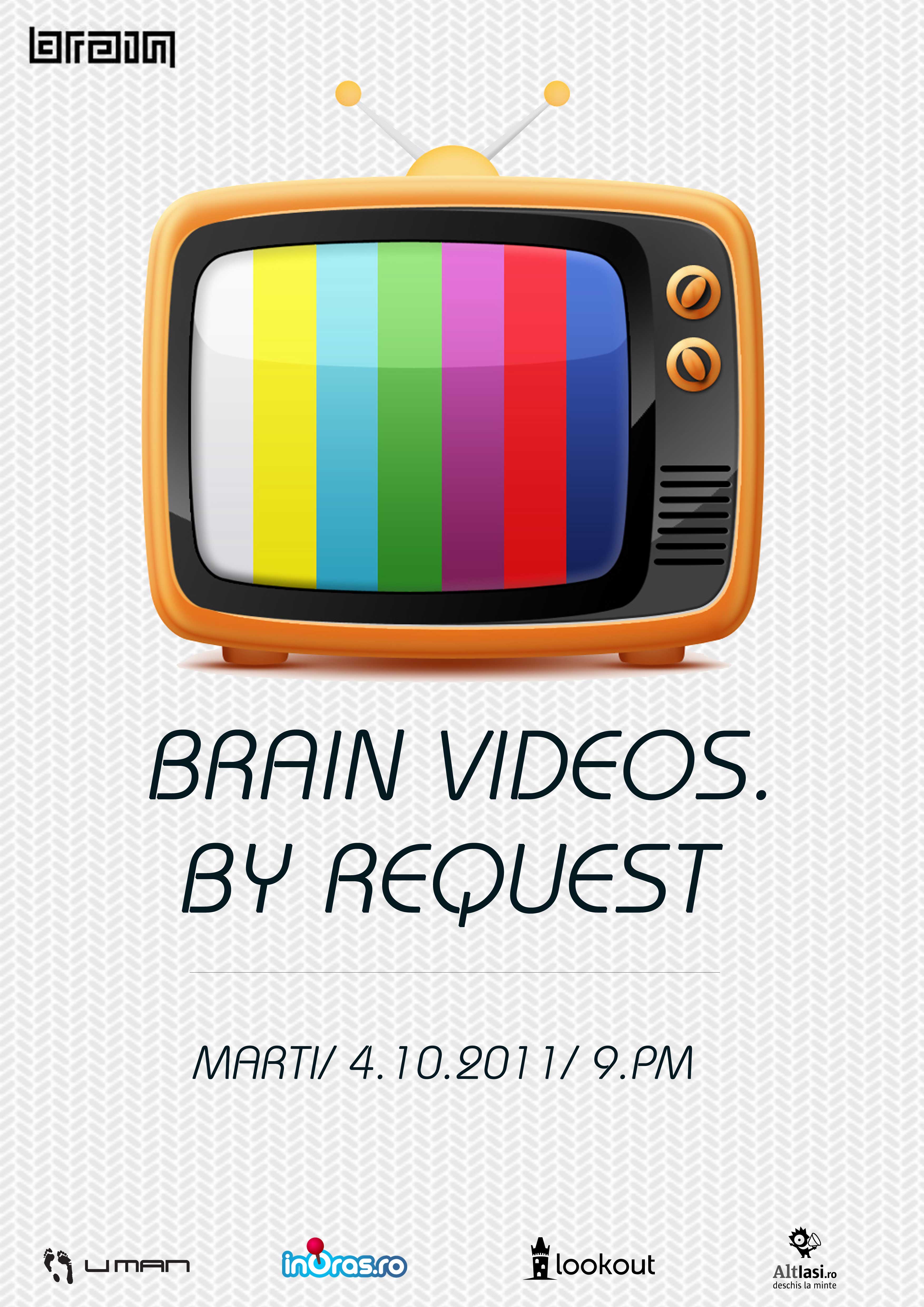 Daca v-ati dorit vreodata sa cereti o melodie preferata in direct la radio sau la televizor, dar nu ati avut curajul sau, pur si simplu, nu ati prins firul liber, acum aveti ocazia sa va impliniti aceasta „guilty pleasure”. In Brain, voi veti fi cei care vor propune videoclipurile preferate. Si pentru ca totul sa fie in ton cu atmosfera Brain cu care sunteti obisnuiti, indrazniti sa iesiti din „conventional” si propuneti videoclipuri „non-mainstream”. Singura conditie este ca alegerile voastre sa fie disponibile pe YouTube, Vimeo sau alte site-uri de video streaming. Organizatorii anunta ca vor avea dreptul la "request" toti cei prezenti in seara respectiva la eveniment. Trebuie doar sa veniti.