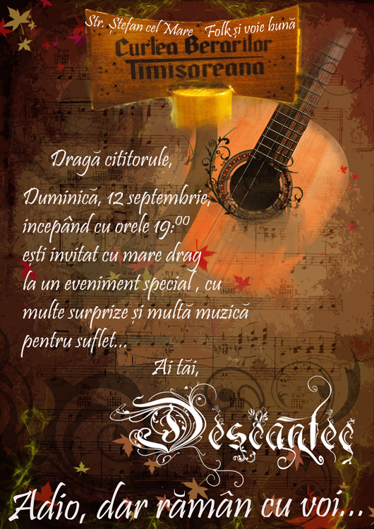 Trupa ieseana de folk Descantec vine la inceput de septembrie cu doua vesti - una buna si una rea. Vestea buna este aceea ca duminica, 12 septembrie 2010, de la ora 19, vor sustine un concert deosebit la Curtea Berarilor Timisoreana de pe bulevardul Stefan cel Mare, insa vestea rea este ca scopul manifestarii este despartirea de solista vocala a formatiei, Madalina Darabana, care a hotarat sa isi urmeze studiile in strainatate.