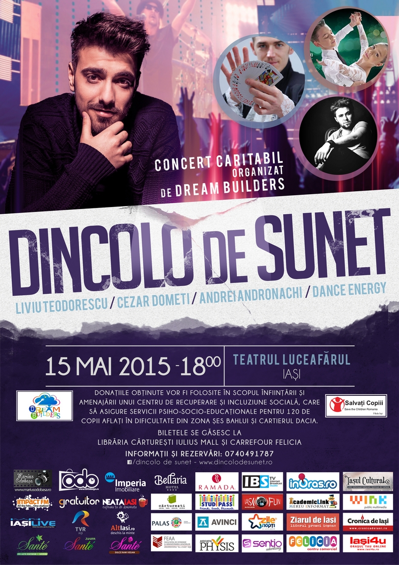 Creat din dorinta de a ajuta 120 de copii aflati in dificultate din zona ses Bahlui si Cartierul Dacia, “Dincolo de sunet” este un eveniment caritabil organizat de catre Dream Builders, o echipa formata din 18 masteranzi in anul II la Facultatea de Economie si Administrarea Afacerilor din Iasi. Evenimentul va avea loc in data de 15 mai 2015, incepand cu orele 18:00 la Teatrul Luceafarul, Iasi.