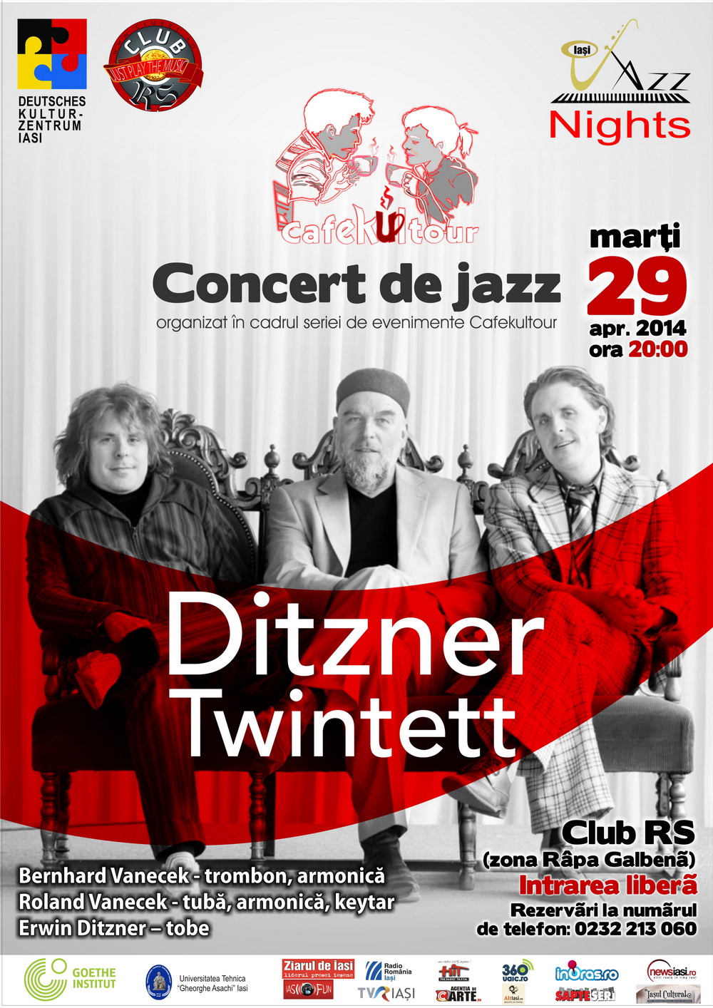 Primul eveniment organizat de Centrul Cultural German Iasi in cadrul CaféKultour 2014 este un concert extraordinar de jazz cu trupa „Ditzner Twintett” din Germania. Dupa cum ne-am obisnuit, gazda este din nou clubul RS, unde suntem asteptati marti, 29 aprilie, incepand cu ora 20:00. Intrarea este libera, insa nu uitati de rezervare!