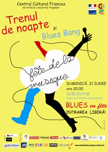 Centrul Cultural Francez in colaborare cu Ambasada Frantei in Romania prezinta cea de-a XIX-a editia a festivalului de muzica Fête de la Musique/Sarbatoarea Muzicii. In acest an, petrecerea va avea loc in Dublin Pub, duminica, 21 iunie, de la ora 20, unde vor concerta trupele de blues Trenul de noapte si Blues Bang.