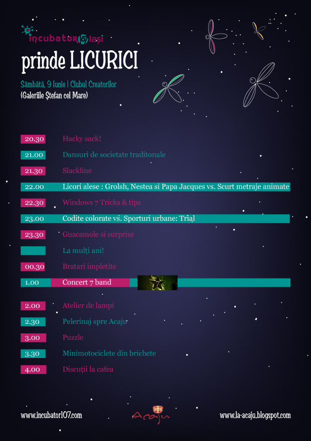 Sambata, 9 iunie, Clubul Creatorilor si Acaju va invita la a treia editie a nocturnei Incubator107, unde veti avea drept ghid o echipa de licurici. Cele sapte ateliere incep de la 20:30, la Clubul Creatorilor; cei ce au participat si la editiile trecute, stiu ca trebuie sa-si aduca de-acasa merinde, pentru a rezista toata noaptea. Fara a uita de cei 10 lei pentru participare, veti putea invata multe lucruri interesante de la mesteri iscusiti, ajutati de echipa ucenicilor licurici.