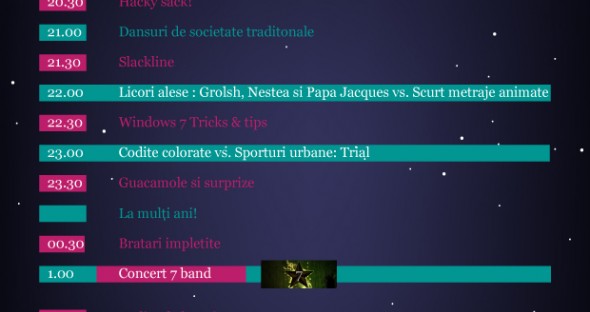 Editia aceasta va propune sa incercati banda de slack line, hacky sack-ul, un trial de sport urban si dansuri de societate. In pauza binemeritata nu va veti plictisi, caci va fi umpluta de scurt metraje animate. Setea v-o puteti potoli cu o bautura rece de la Grolsch, Nestea si Burn sau puteti incerca o cafea aromata de la Papa Jacques; la atelierul de tricks & tips, veti ciuli urechile la pont-uri despre Windows 7, iar surprizele vin cu guacamole. Inainte de a lua parte la atelierul de lampi al licuricilor, puteti invata sa impletiti codite sau bratari.