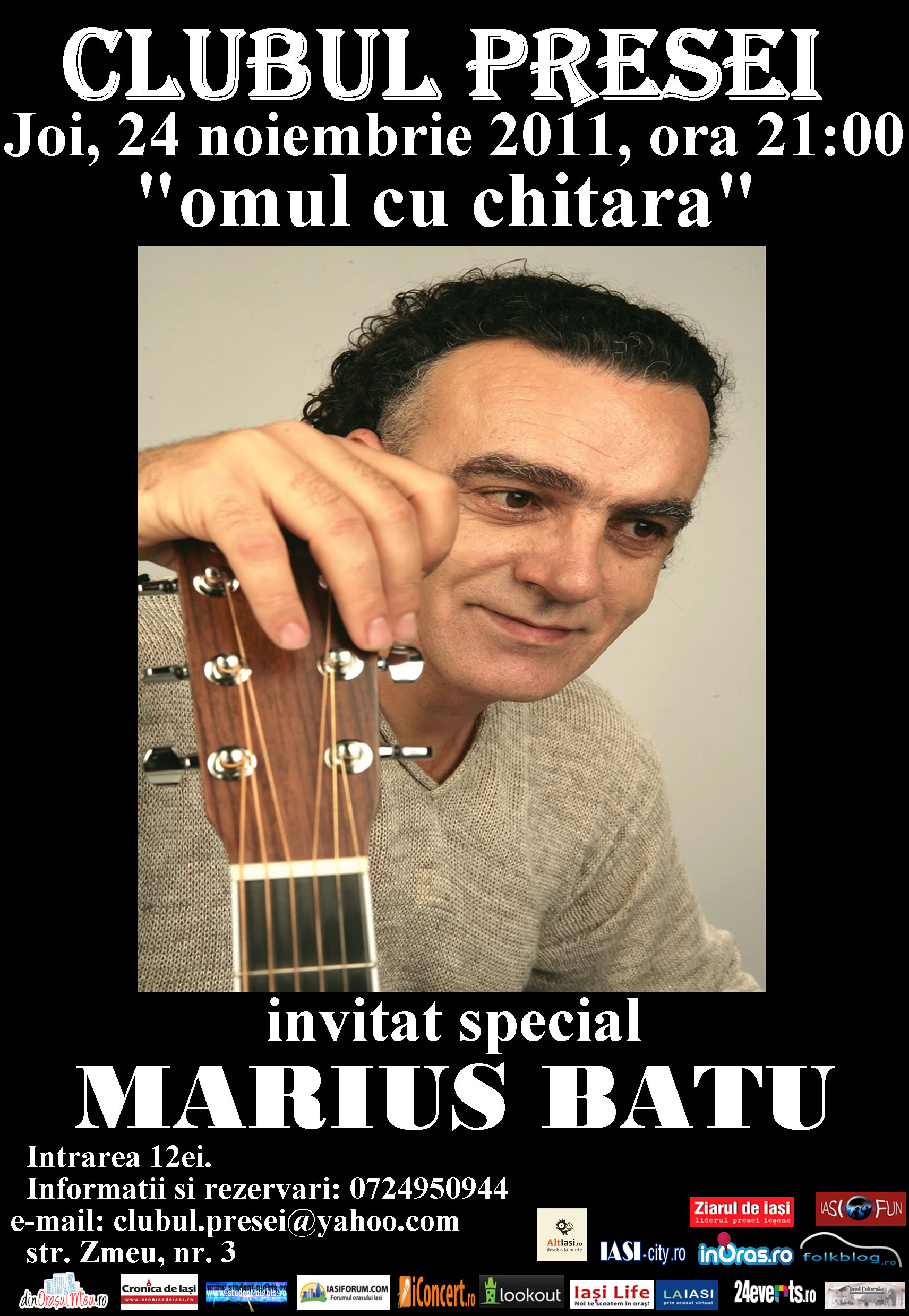 Dupa o aventura in zona muzicii rock, Omul cu chitara acapareaza din nou seara de joi din Clubul Presei. Saptamana aceasta este randul unui artist ce nu a tradat niciodata de-a lungul carierei sale genul folk, Marius Batu, cel care va fi prezent la Iasi pe 24 noiembrie intr-un concert ce va debuta la ora 21.