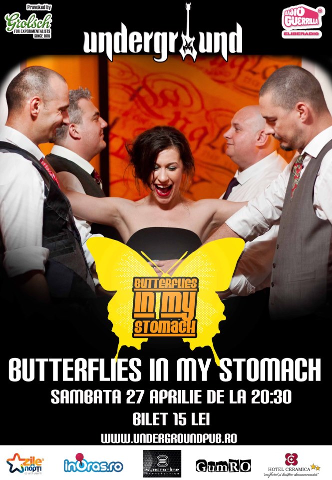 Seria de doua concerte pe weekend continua in Underground Pub si saptamina aceasta. Dupa ce il puteti asculta vineri pe Norzeatic, poezia continua si simbata seara (27 aprilie) cind trupa cu „Tricoul”, Butterflies in My Stomach, vor cinta o muzica ce contine funk, nu-jazz, electro, trip-hop sau chill, undeva dupa ora 22. Pretul unui bilet este 15 lei.