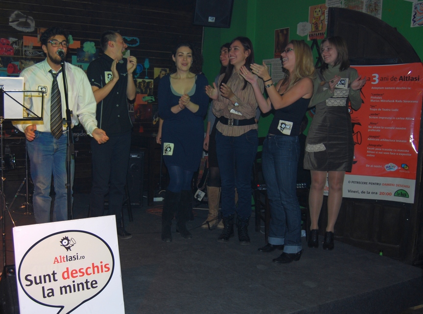 Forfota anunta un inceput bun, dar trebuia cat mai degraba prinsa si canalizata spre pretextul intalnirii: sarbatorirea celor 3 ani de cand ne cunoastem cu voi. Dragos a intuit momentul, iar microfonul a fost al lui. A povestit cine-i AltIasi, ce face el in timpul liber, ce spera. Era plin in Baza. Momentul discursului trebuia sa fie cat mai sprinten – in cele din urma era o seara de distractie – ca sa nu piarda pe nimeni. Oamenii erau atenti, iar asta se putea verifica prin reactiile lor imediate la ceea ce spunea Dragos. Deja aveam de ce sa ne simtim mai linistiti pentru ca ne dadeam seama ca se solidifica puntea dintre noi si voi.