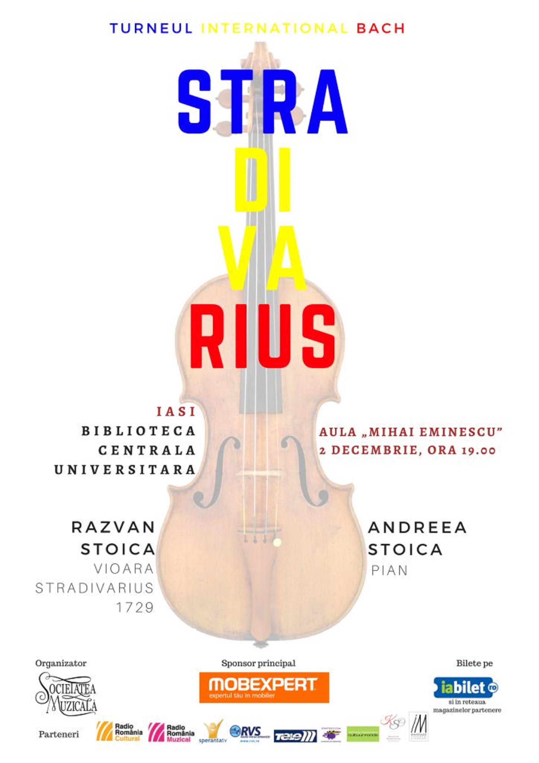 Societatea muzicală invită publicul ieșean la un concert special, dedicat Zilei Naționale a României, în data de 2 decembrie, începând cu ora 19.00, la Aula „Mihai Eminescu” a Bibliotecii Centrale Universitare. După ce au cucerit publicul celor mai importante centre culturale, premii importante la marile concursuri internaționale, și au realizat mai multe albume cu case de discuri importante, Andreea și Răzvan se vor afla, în luna noiembrie, în primul turneu național, alături de vioara Stradivarius „The Queen” exErnst fabricată în 1729 – un instrument care, pe lângă renumele lutierului care a fabricat-o, se află în centrul multor întâmplări alături de geniile violonisticii contemporani – și nu numai (Paganini, Bazzini, Ernst s.a.).