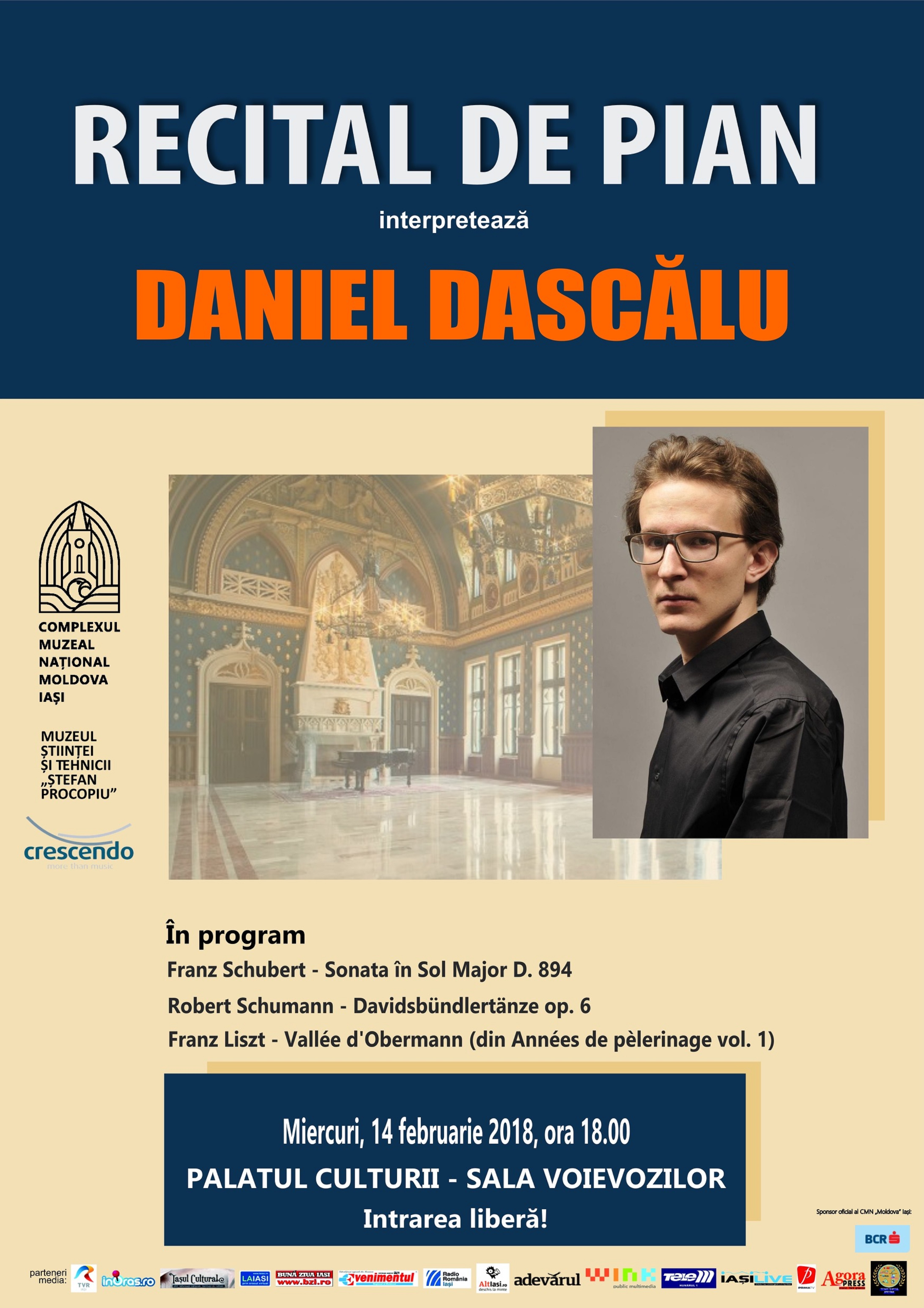 Complexul Muzeal Național Moldova” Iași – Muzeul Științei și Tehnicii „Ștefan Procopiu”, în parteneriat cu Fundația „Crescendo International” vă invită să participați la Recitalul de pian susținut de Daniel Dascălu, student al Universității de Muzică din Viena, laureat al unor prestigioase concursuri naționale și internaționale de interpretare.