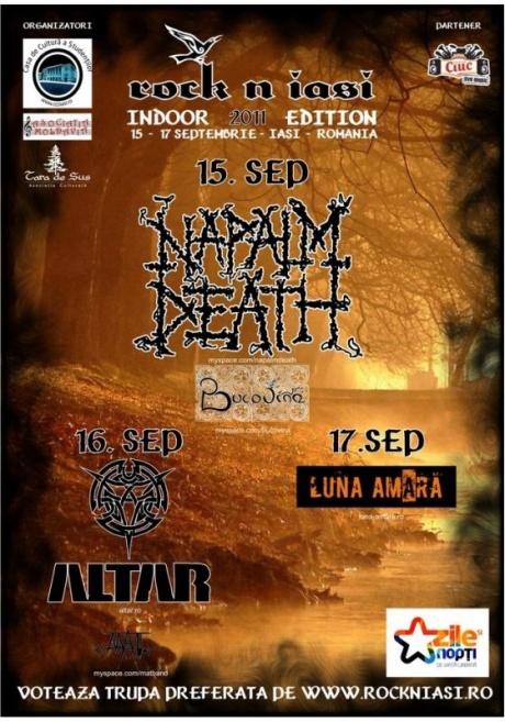 De pe 15 pana pe 17 septembrie, Iasul va fi gazda celui mai mare festival de rock din Moldova - Rock'n Iasi 2011. Publicul acestei editii va putea fi aproape de Napalm Death, Bucovina, ALTAR, MAT, Luna Amara si alte 10 trupe invitate, in Foaierul Casei de Cultura a Studentilor.