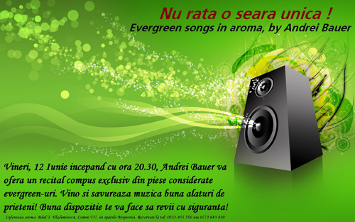 Cei care s-au obisnuit deja cu recitalurile lui Andrei Bauer in aroma vor avea parte vineri, 12 iunie, incepand cu ora 20.30 de o seara speciala pentru ca interpretul iesean va canta piese considerate "evergreen-uri", melodii ale unor artisti celebri.
