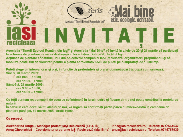 Vineri (20 martie) si sambata (21 martie) va avea loc o campanie de plantare de puieti in localitatea Dobrovat. Actiunea cu tenta ecologista este organizata de Asociatia "Tinerii Ecologi Romani din Iasi" si Asociatia "Mai bine".