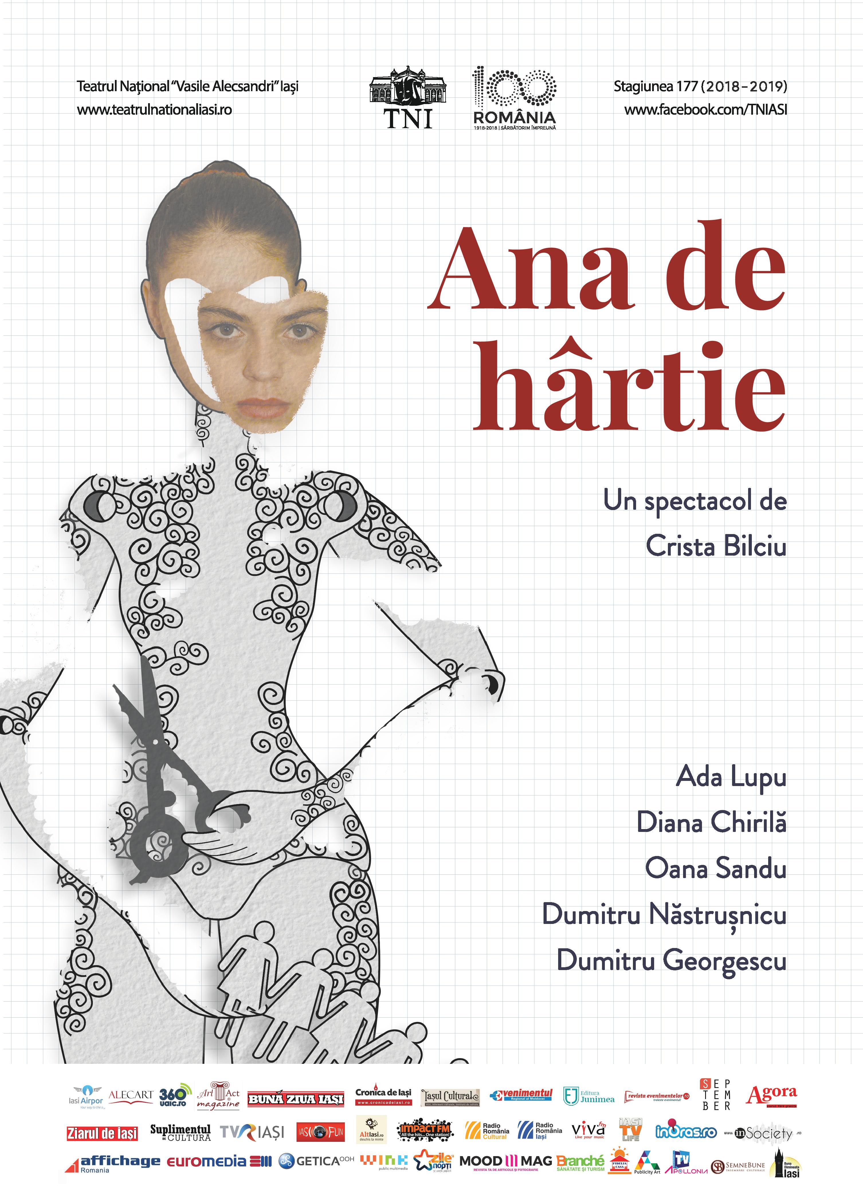 „Ana de hârtie” este cea de-a doua premieră pe care Teatrul Național Iași o propune publicului în această stagiune. Un spectacol de Crista Bilciu, programat pe 28 și 29 octombrie, de la 19:30, la Uzina cu Teatru. Pe afiș, actorii Ada Lupu, Diana Chirilă, Oana Sandu, Dumitru Năstrușnicu, Dumitru Georgescu. Crista Bilciu, regizor de teatru și scriitoare, propune un text și un spectacol pline de emoție, care provoacă prin tema abordată: căutarea identității la vârsta adolescenței. Un spectacol pe care Teatrul Național Iași îl propune atât tinerilor, cât și părinților acestora. În 2019 se joacă în ianuarie, februarie, aprilie și 6 mai.