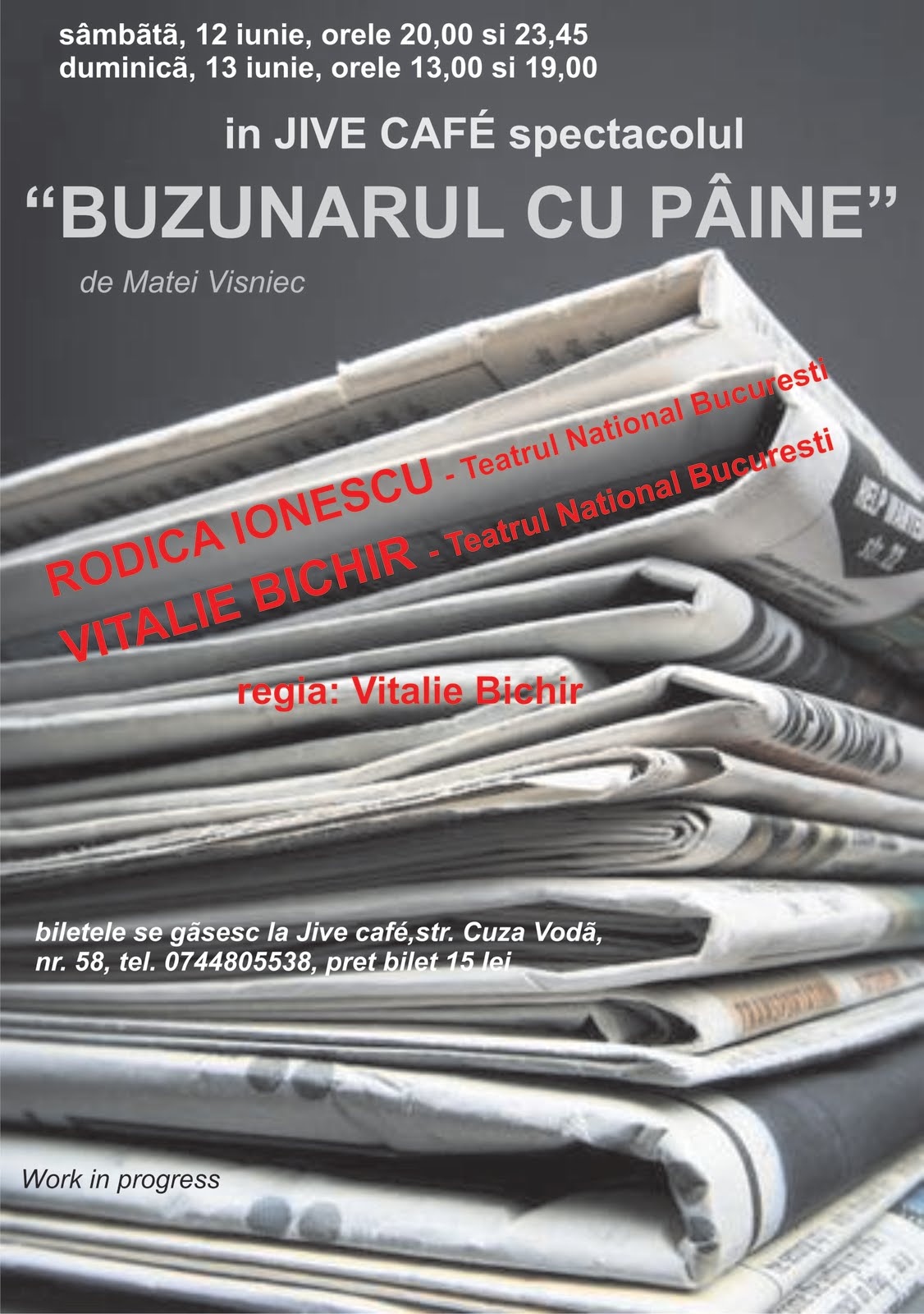 Sambata si duminica, sunteti invitati in Jive Cafe, unde Teatrul National din Bucuresti prezinta spectacolul Buzunarul cu paine de Matei Visniec, in regia lui Vitalie Bichir.