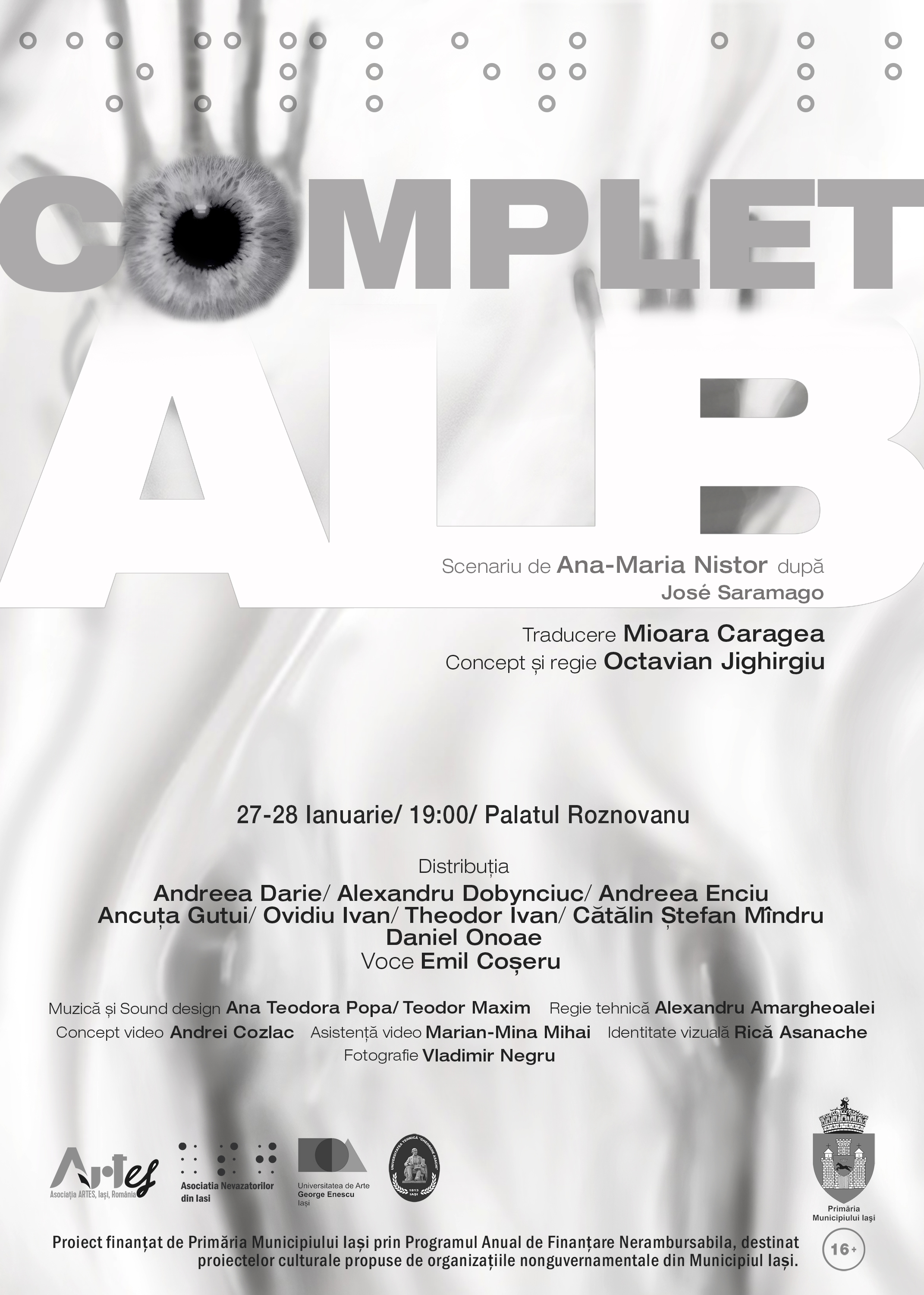 Asociatia ARTES in parteneriat cu Asociatia Nevazatorilor - filiala Iasi, anunta o dubla premiera: pentru prima oara la noi in tara este pus in scena un spectacol cu un scenariu dupa José Saramago. In plus, pentru ca universul fictiunii din romanul „Eseu despre orbire” sa ajunga cat mai bine la public, artistii din proiectul Complet alb au decis ca spectacolul sa fie o experienta singulara, bazata pe senzorialitate. Premiera nationala oficiala a spectacolului Complet alb va avea loc in zilele de 27 si 28 ianuarie 2017, ora 19.00, in Sala Mare a Consiliului Local (Palatul Roznovanu). Primul spectacol al lunii februarie va avea loc la sediul Universitatii de Arte George Enescu, in data de 2 februarie, incepand cu ora 20.00.
