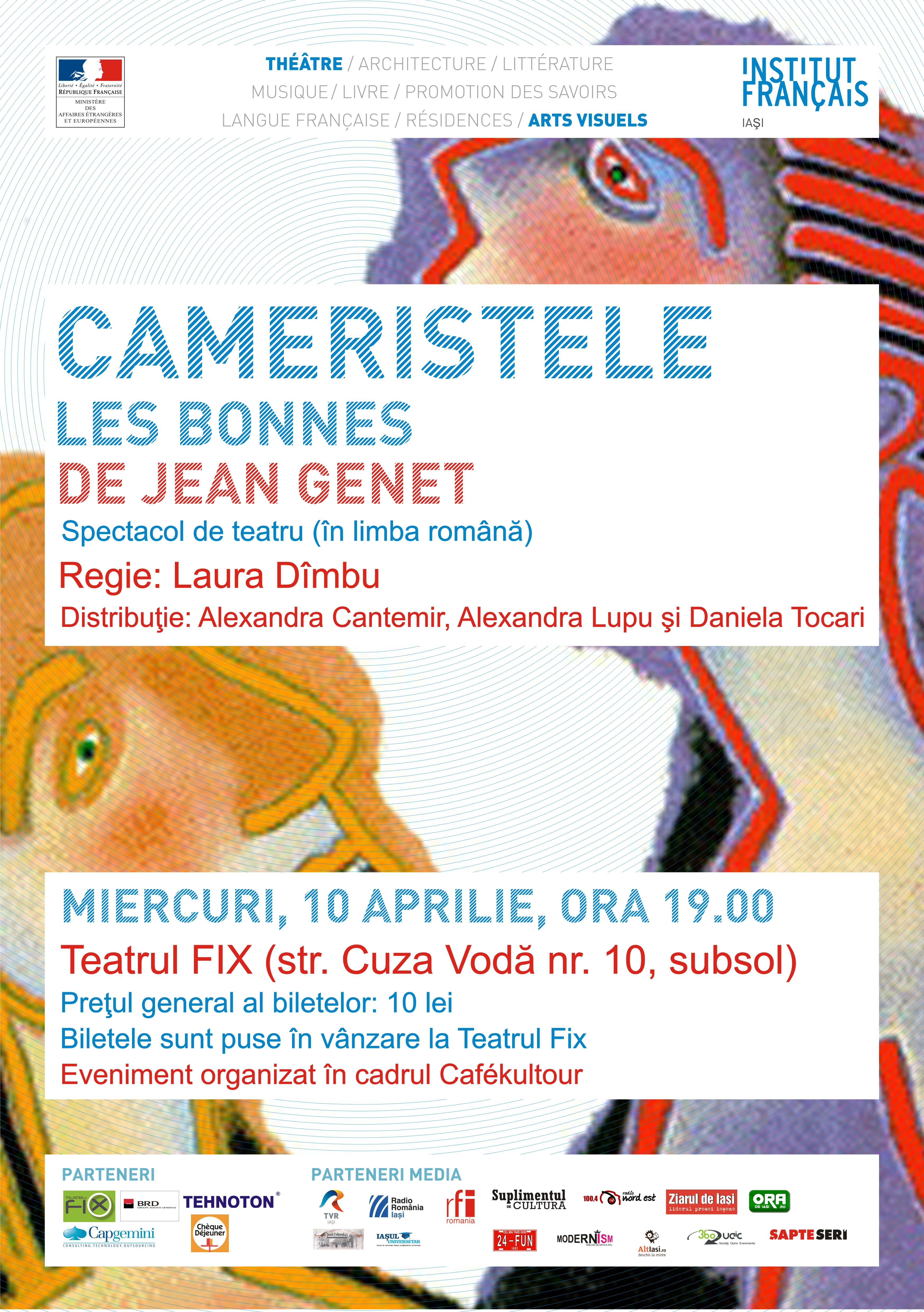 Miercuri, pe 10 aprilie, Teatru Fix ne primeste, incepind cu ora 19:00, la piesa Cameristele, scrisa de Jean Genet si regizata de Laura Dimbu. Acest spectacol este organizat de Institutul Francez Iasi in cadrul celei de-a opta editii a Cafékultour, care se va desfasura in perioada 8-21 aprilie. Update: spectacolul se reia joi, 17 octombrie, de la ora 19:00, tot la Teatru Fix.