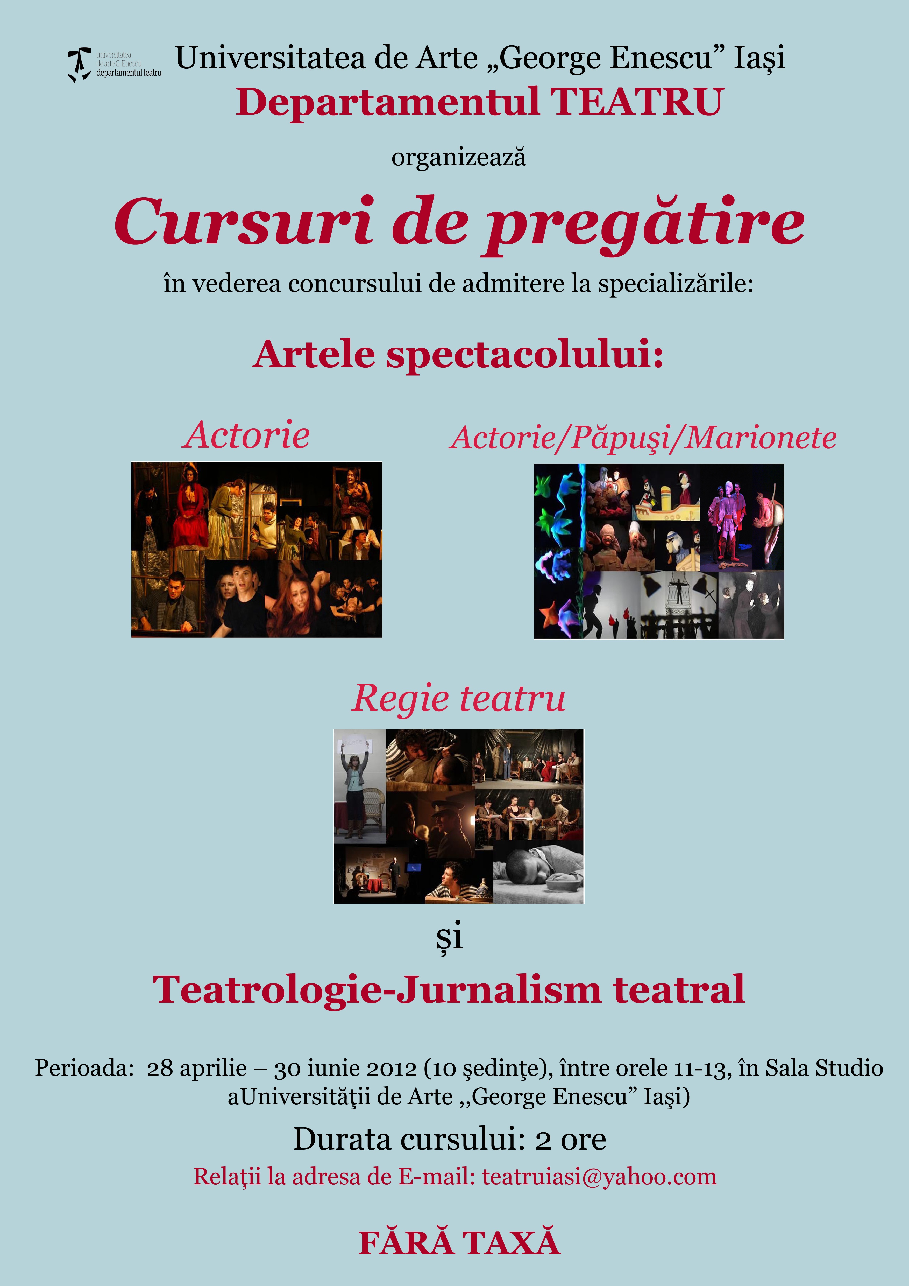 Doresti sa devii actor, actor-papusar, regizor, sau de ce nu, critic de teatru? Acum e mai simplu sa afli daca visul tau poate fi concretizat! In perioada 28 aprilie - 30 iunie, Departamentul Teatru al Universitatii de Arte “George Enescu” organizeaza cursuri pregatitoare pentru admiterea la Facultatea de Teatru. 10 cursuri cu durata a 2 ore fiecare se vor desfasura in Sala Studio a UAGE (si anexele ei) in fiecare sambata din intervalul mai sus amintit, intre orele 11-13.