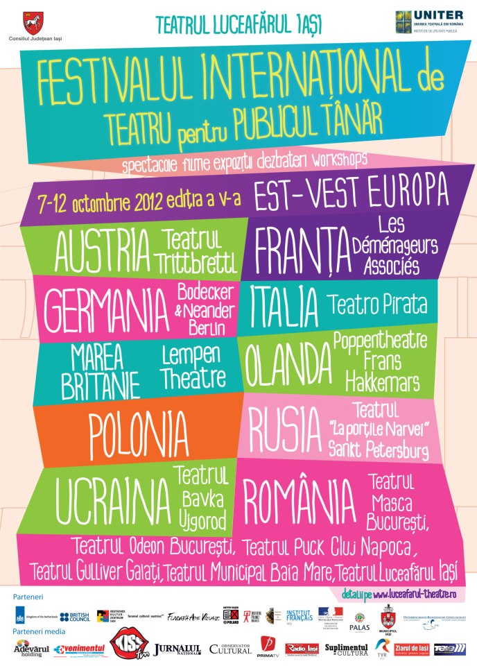 Cea de-a cincea editie a Festivalului International de Teatru pentru Publicul Tanar (FITPT) se pregateste de debut la finele acestei saptamani, cu un mic renaming care anunta o usoara repozitionare (de la “pentru Copii si Tineret” la “pentru Publicul Tanar”). Astfel, de duminica, 7 octombrie si pana vineri, 12 octombrie, Teatrul Luceafarul va fi gazda celor 14 companii teatrale din tara si strainatate invitate ce vor sustine 18 reprezentatii. Deasemenea, in cadrul aceluiasi festival – probabil cel mai puternic si important pe plan regional care are loc in prezent la Iasi – publicul iubitor de arta va putea viziona 4 filme (artistice si documentare), 2 expozitii si participa la o dezbatere.