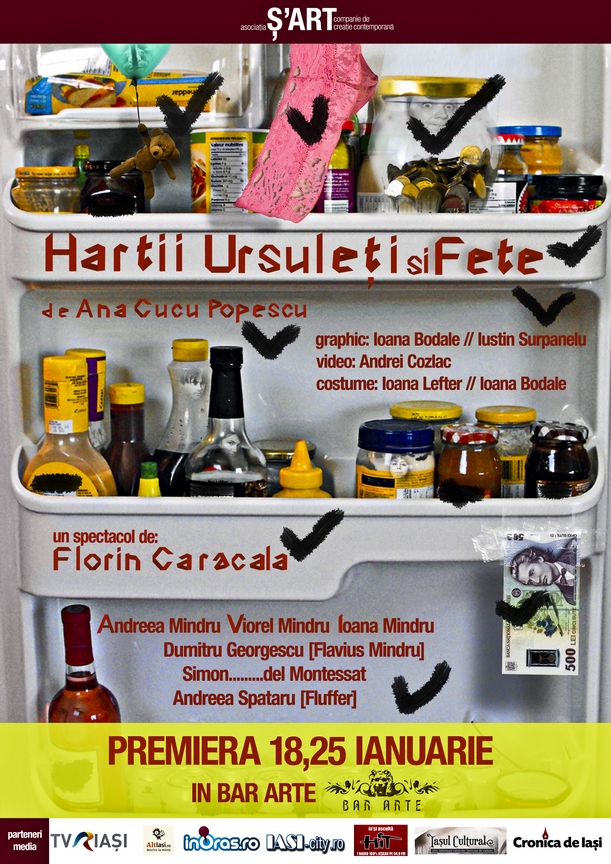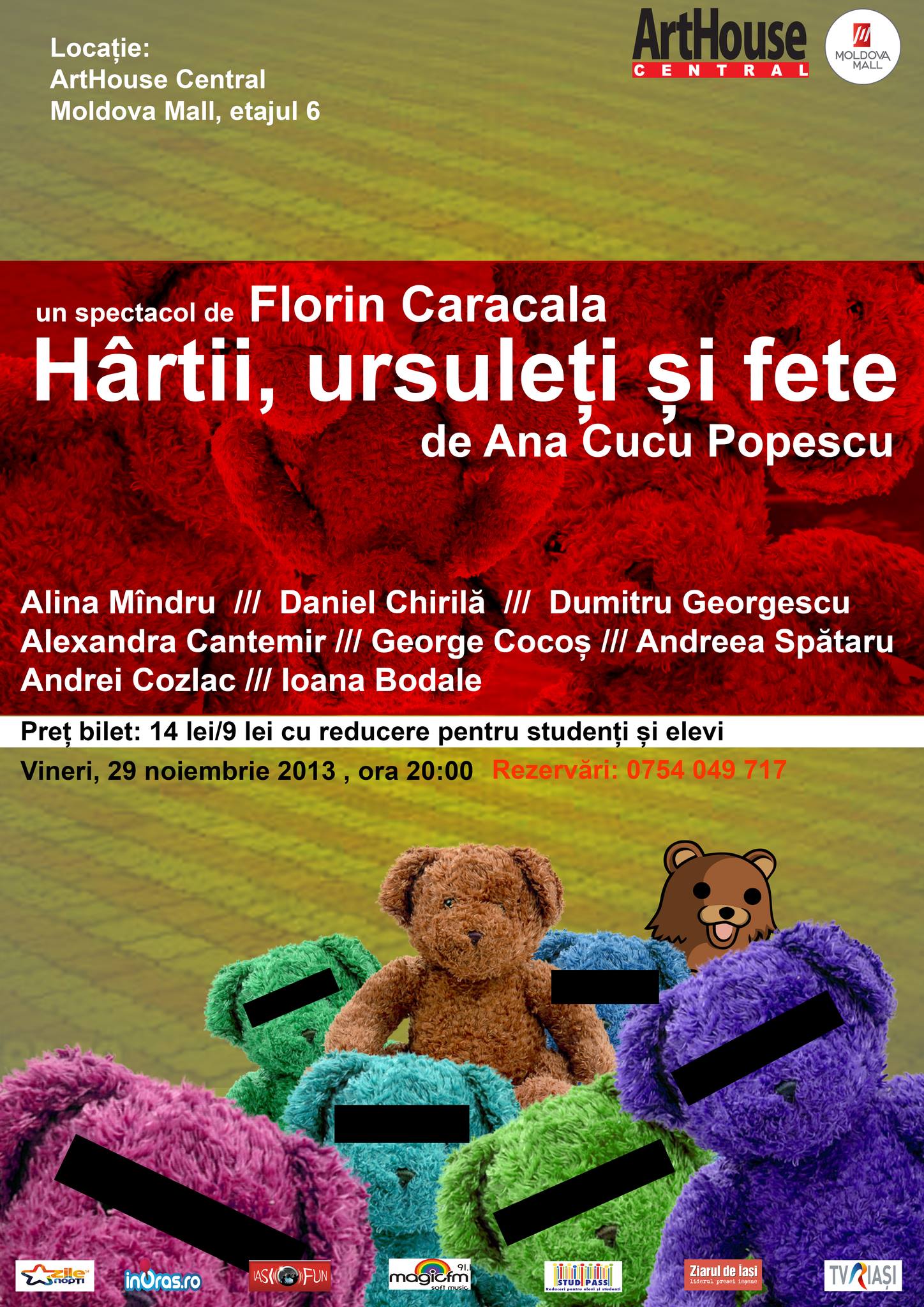 Asociatia S’ART prezinta miercuri, 18 ianuarie 2012, de la ora 20:00, premiera spectacolului Hartii, ursuleti si fete de Ana Cucu Popescu, in regia lui Florin Caracala. Evenimentul va avea loc la Bar Arte, strada Horia nr. 8, la care pretul va fi de 15 lei. Cea de-a doua reprezentatie va avea loc in data de 25 ianuarie, biletul urmand sa coste doar 10 lei. Spectacolul se joaca din nou joi, 10 ianuarie 2013, de la aceeasi ora si in acelasi loc. Update: spectacolul se joaca pe 29 noiembrie la ArtHouse Central, si vineri, 14 martie 2014, la Cafepedia Iasi, de la aceeasi ora, cu niste modificari in distributia initiala, Daniel Chirila alaturandu-se echipei.