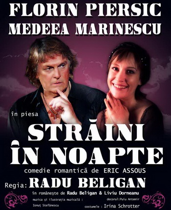 Marti, 22 februarie 2011, incepand cu ora 19.00, la Casa de Cultura a Studentilor, veti putea urmari piesa de teatru "Straini in noapte", o comedie romantica, cu o distributie de exceptie: Florin Piersic si Medeea Marinescu. Schimbarea distributiei ne-o aduce in prim-plan pe Medeea Marinescu, actrita cunoscuta de noi pentru rolurile din Maria Mirabela din anul 1982, cu o regie semnata de Ion Popescu Gopo, Promisiuni 1985-regia: Elisabeta Bostan sau Weekend cu mama 2009-regia: Stere Gulea.