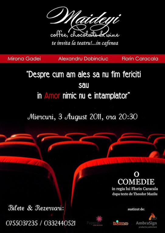 Astfel ca, miercuri, 3 august, de la 20.30, sunteti asteptati pentru o ultima vizionare a spectacolului Cum am ales sa nu fim fericiti sau in amor nimic nu e intamplator, realizat dupa un text Theodor Mazilu. Din distributie fac parte: Mirona Gadei, Alexandru Dobinciuc si Florin Caracala.