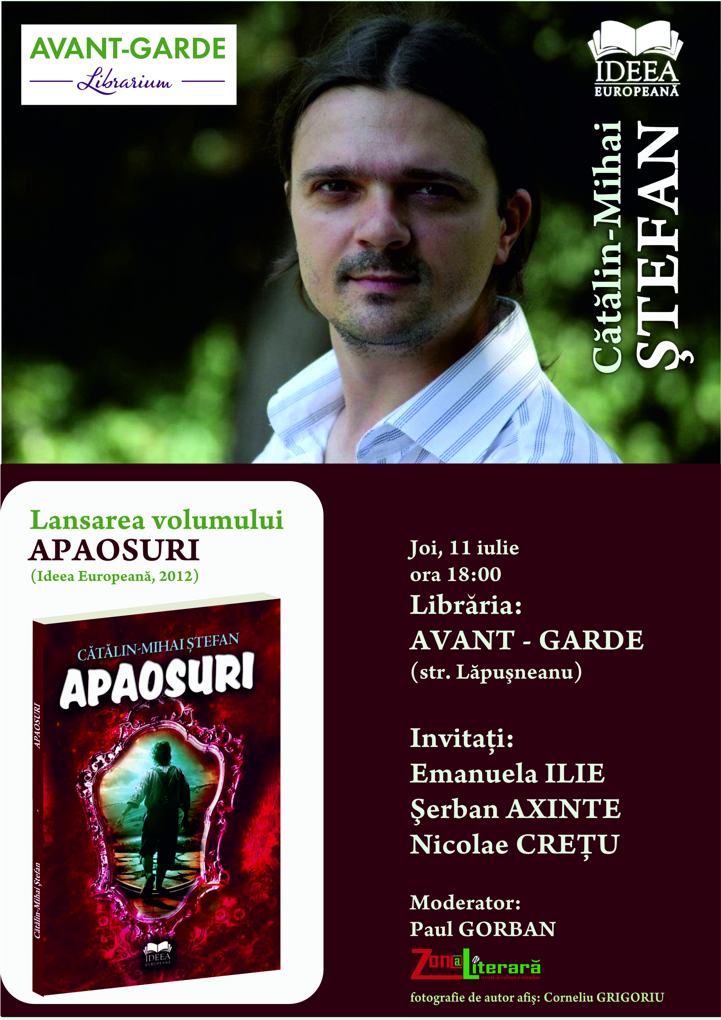 Cei cu si in stare de poezie ar trebui sa treaca joi, 11 iulie, la ora 18:00, pe la libraria Avant-Garde. Lirica ieseana se va demonstra de aceasta data prin intermediul lui Catalin-Mihai Stefan, care isi va lansa volumul Apaosuri, ce a fost luat deja la proba de criticii literari invitati, si anume de Emanuela Ilie, Serban Axinte si Nicolae Cretu. Cum evenimentul este sprijinit de revista Zon@ Literara, moderator nu putea fi nimeni altul decat Paul Gorban.