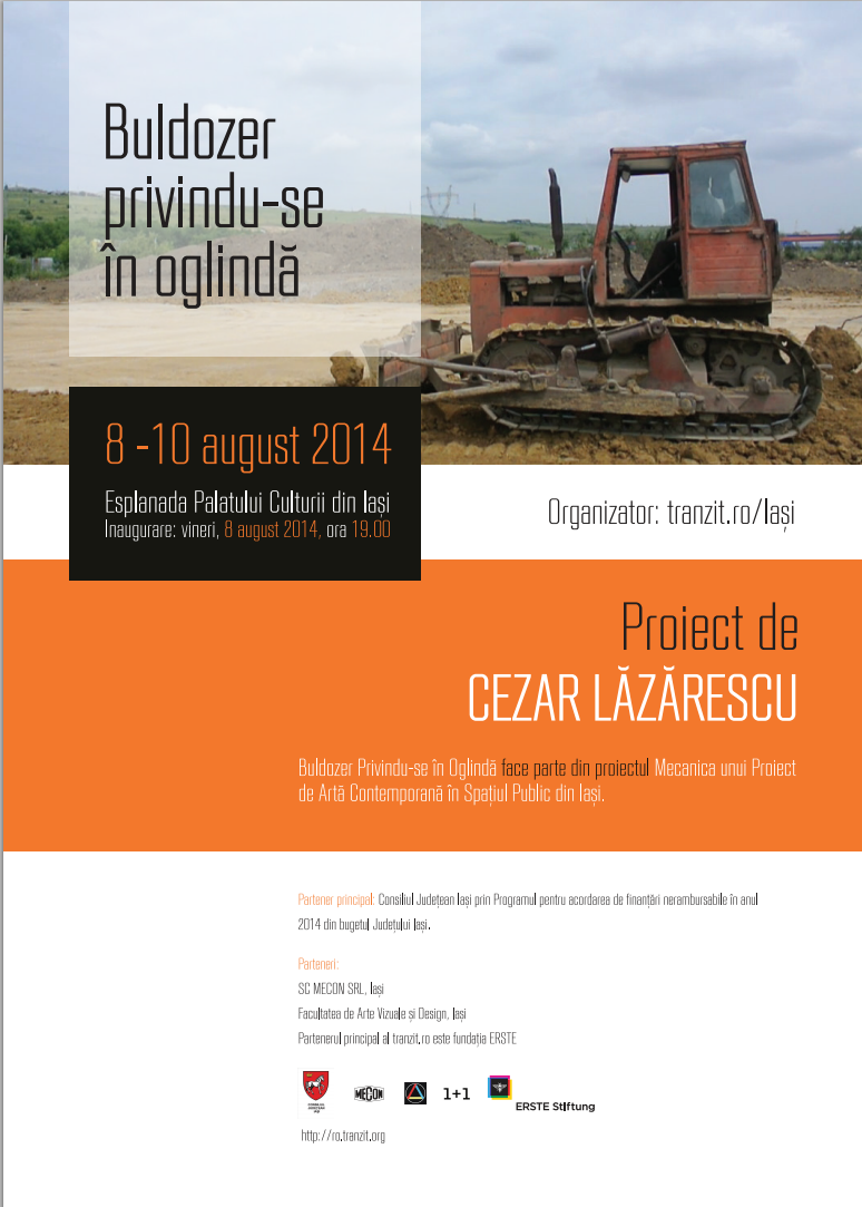 Week-end-ul acesta, 8, 9, 10 august 2014, pe Esplanada Palatului Culturii din Iasi are loc punerea in scena a proiectului artistului Cezar Lazarescu, „Buldozer privindu-se in oglinda”. Inaugurarea are loc vineri, 8 august 2014, de la ora 19.00.