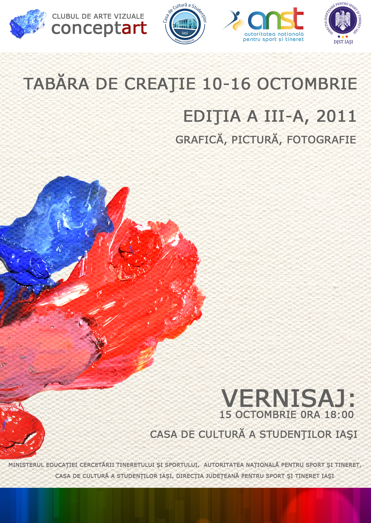In perioada 10-15 octombrie 2011 va avea loc la Muncel, linga Pascani, cea de-a III-a editie a Taberei Nationale de Creatie “ConceptART” organizata de Casa de Cultura a Studentilor din Iasi in colaborare cu ANST, Clubul de Arte Vizuale “ConceptART” si DJTS Iasi. Tabara se va incheia cu un vernisaj, organizat pe data de 15 octombrie de la ora 18.00 la Casa de Cultura a Studentilor.