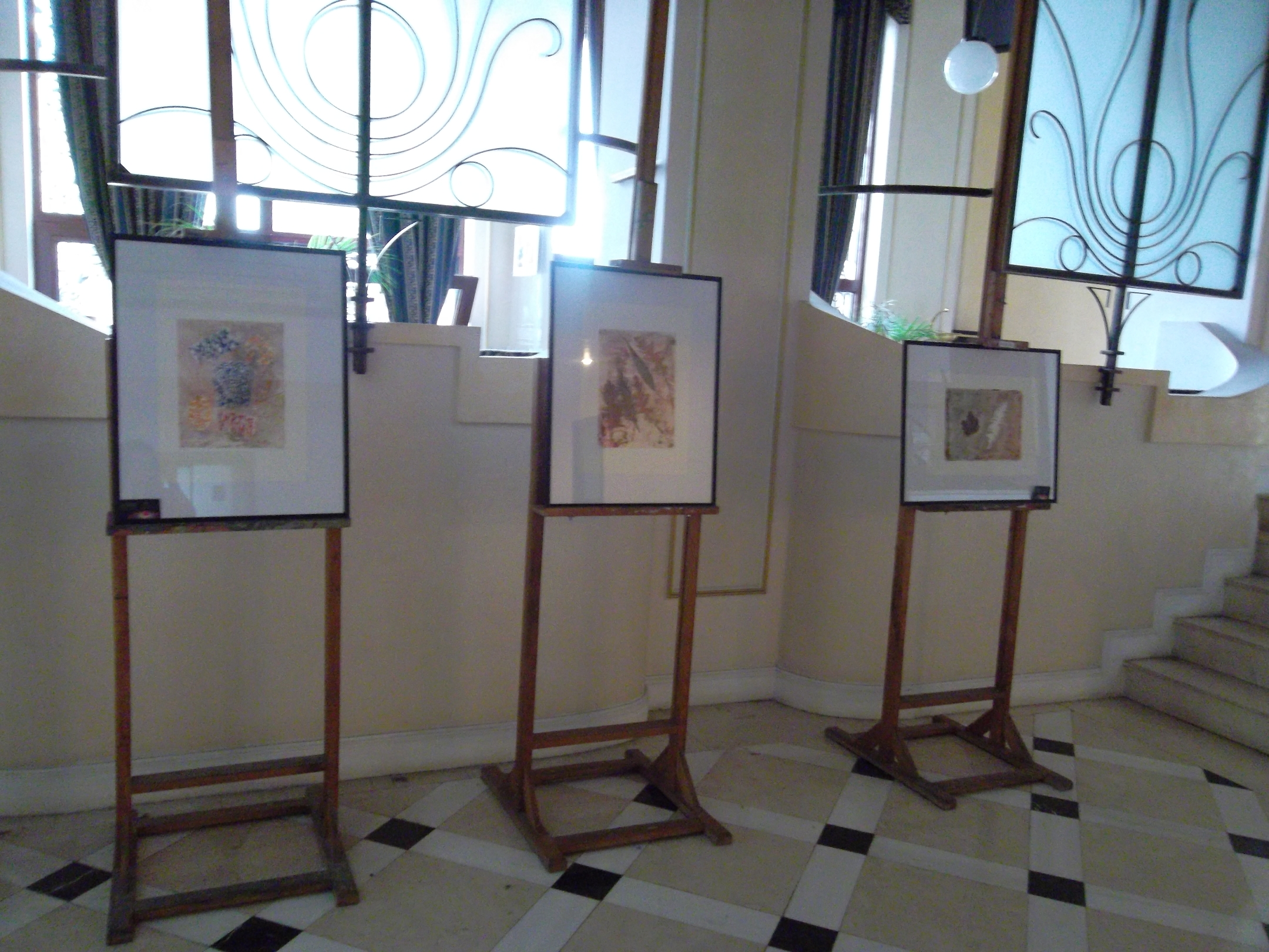 Alaturi de lucrarile din sticla, tanarul a pregatit si prezentarea a 13 tablouri de grafica monotip, cu scopul de a infatisa o alta ramura a artei careia se dedica. Acest procedeu face parte din tehnicile grafice, prin el obtinandu-se anumite efecte. Tehnica are un caracter de unicat cu efecte coloristice si decorative compozitionale. Lucrarile prin tehnica monotipiei presupun folosirea ca suport de lucru a unor materiale ca sticla, metalul, linoleumul, pe care se realizeaza imaginile propuse. De asemenea, subiectele naturale abordate (pana, frunza) amintesc de o alta tehnica, si anume cea a frotajului, tehnica a imprimarii dupa suprafetele unor structuri din natura. De aceasta data, culoarea nu mai este la fel de vie, puternica, ci se stinge usor spre nuante mai cumpatate in favoarea sugerarii efectului.