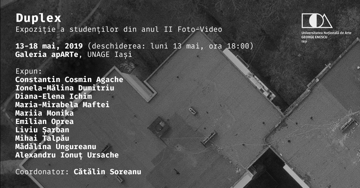 "Duplex" este o expoziție a studenților din anul II al specializării Fotografie, Video, Procesarea computerizată a imaginii din cadrul Facultății de Arte Vizuale și Design a Universității Naționale de Arte "George Enescu" Iași ce va avea loc în perioada 13 - 18 mai 2019. Deschiderea: luni, 13 mai, ora 18:00, la Galeria apARTe din cadrul UNAGE Iasi.