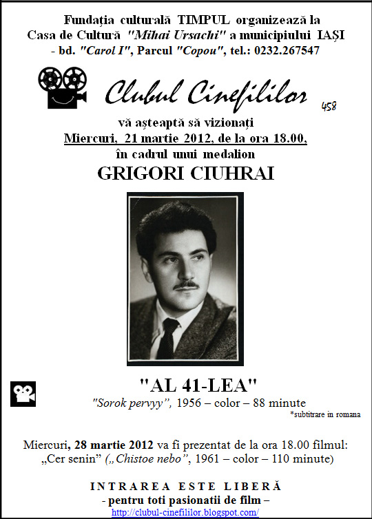 Miercuri, 21 martie, de la ora 18.00, Clubul Cinefililor va asteapta la Casa de Cultura “Mihai Ursachi” pentru a urmari si supune dezbaterii cel de-al doilea film din medalionul dedicat regizorului ucrainean Grigori Ciuhrai. Al 41-lea (1956) este una dintre operele cinematografice care marcheaza lupta filmului sovietic pentru independenta, ilustrand pe marele ecran iesirea artei din corsetul ei ideologic dupa moartea lui Stalin, in 1953.