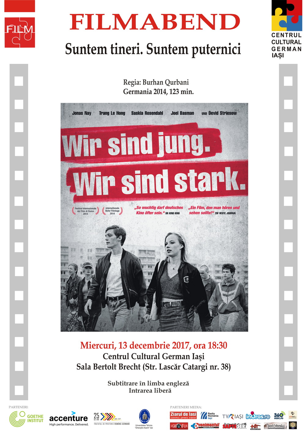 Centrul Cultural German Iasi va invita la Seara de Film German miercuri, 13 decembrie, incepand cu ora 18:30, in sala Bertolt Brecht. Va fi prezentat filmul german Wir sind jung, wir sind stark (Suntem tineri. Suntem puternici) in regia lui Burhan Qurbani, din anul 2014. In rolul principale ii puteti vedea pe actorii Jonas Nay, Joel Basman si Saskia Rosendahl. Prin intermediul filmului, regizorul reconstituie evenimentele care s-au petrecut in Rostock-Lichtenhagen in data de 24 august 1992, prezentate din perspectiva unor persoane diferite.