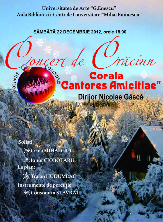 Apropierea sarbatorilor de iarna a adus o aglomerare de evenimente muzicale in Iasi, de o calitate (de cele mai multe ori asumata) care variaza de la profesionism la amatorism. Pentru cei care vor sa asculte un concert de Craciun in interpretarea unui cor cu traditie, “Cantores Amicitiae” reprezinta o foarta buna optiune sambata, 22 decembrie, de la ora 18:00 in Aula Bibliotecii Universitare “Mihai Eminescu”.