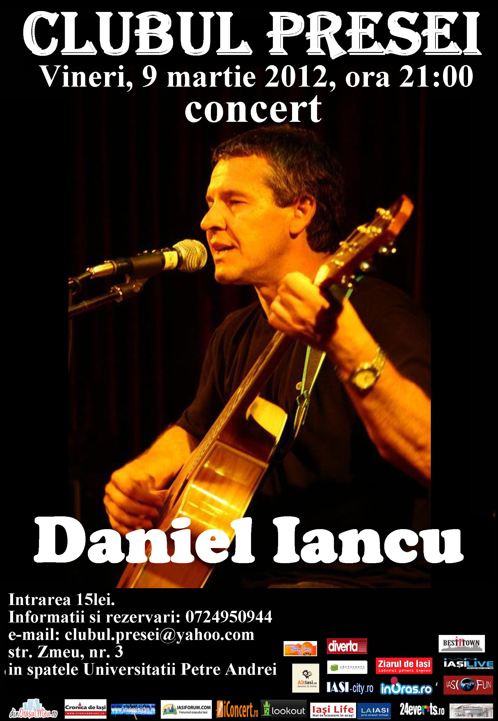 Vine valu' si-l aduce pe Daniel Iancu la Iasi! Este pentru prima oara in acest an in care cantaretul de muzica folk ne viziteaza orasul si se anunta un concert cu multe rasete si povesti care mai de care. Voia buna va fi la ea acasa vinerea aceasta, 9 martie, de la ora 21, in Clubul Presei.