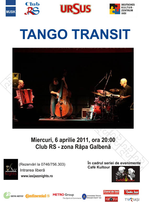 Miercuri, 6 aprilie 2011, incepand cu ora 20.00, in Club RS, Centrul Cultural German Iasi va invita la concertul de jazz tango sustinut de trioul TANGO TRANSIT din Germania, care va avea loc in cadrul seriei de evenimente CafeKultour 2011. Intrarea este libera. Update: Trupa se reintoarce in Iasi si concerteaza in aceeasi locatie joi, 30 mai 2013, de la ora 20:00, iar luni, 23 iunie 2014, de la ora 20:30 in parcul Palas.