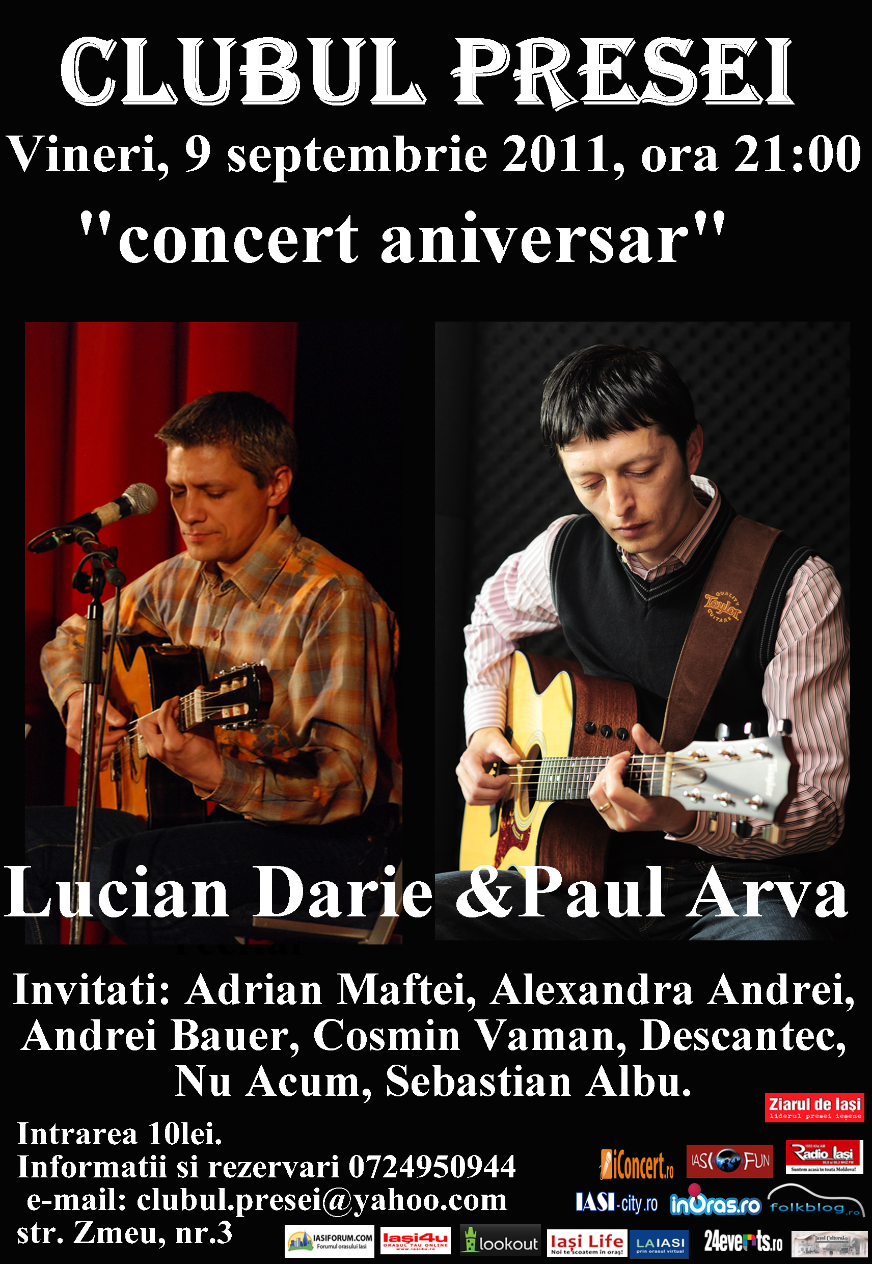 Impreuna. Adica de cand canta impreuna. Si cum un astfel de moment nu poate trece neobservat, atunci se lasa cu sarbatoare si cu prezenta la aceasta a multor prieteni de pe scena muzicala ieseana. Asadar, vineri, 9 septembrie, incepand cu ora 21, Lucian Darie si Paul Arva vor sustine un concert aniversar in Clubul Presei si ii vor avea alaturi pe Adrian Maftei, Alexandra Andrei, Andrei Bauer, Cosmin Vaman, Descantec, Nu Acum si Sebastian Albu.