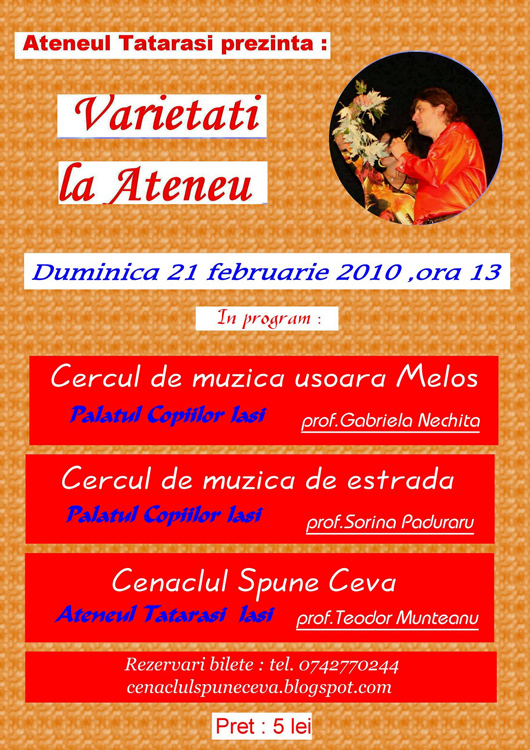 Rezervari se pot face la numarul de telefon 0742 770 244, iar cei care doresc sa se inscrie in cenaclul de folk Spune Ceva sunt asteptati la spectacolul de la Ateneul Tatarasi.