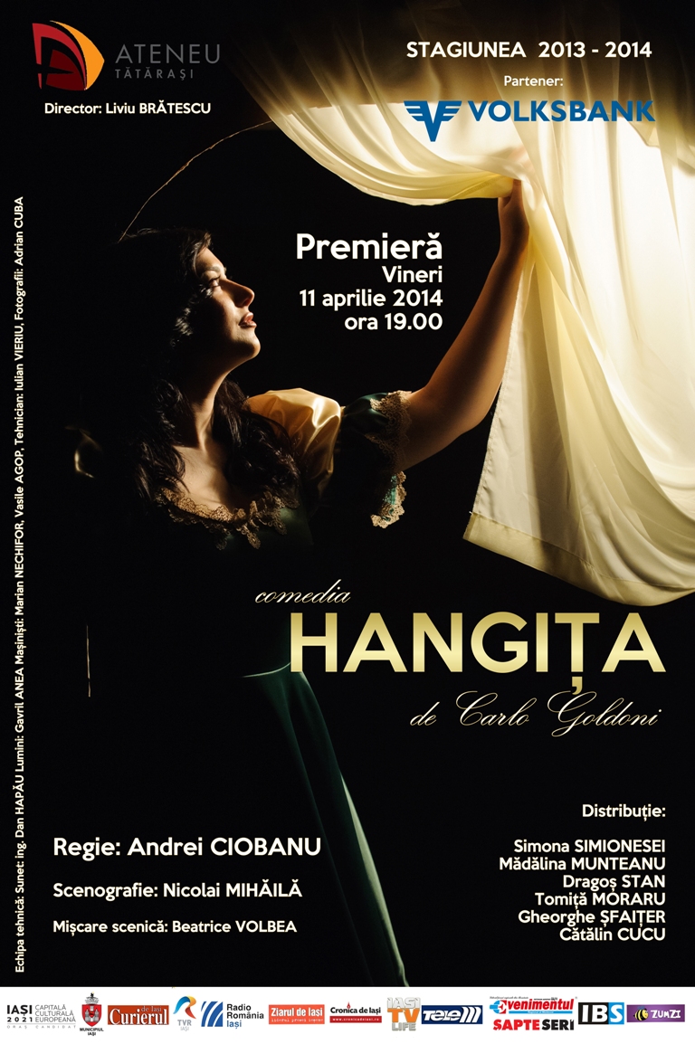 Ateneul Tatarasi isi propune sa puna in scena in jur de 6 premiere anual. Primavara aceasta stagiunea continua si se va juca o comedie de Carlo Goldoni, Hangita, in regia tanarului actor, Andrei Ciobanu. Premiera va avea loc pe 11 si pe 13 aprilie. Dupa aceasta, ne mai sunt rezervate si alte surprize, deoarece a existat un concurs de proiecte, dintre care au fost alese cele mai interesante din punctul de vedere al institutiei amintite. Urmatoarele reprezentatii vor avea loc pe 25 si 26 aprilie, 11 si 17 mai. Update: in stagiunea 2014-2015 spectacolul este programat pentru 7 noiembrie de la 12:30, 15 noiembrie de la ora 16:00, 25 ianuarie, 13 februarie, 1 martie, 6 iunie, de la ora 19:00.